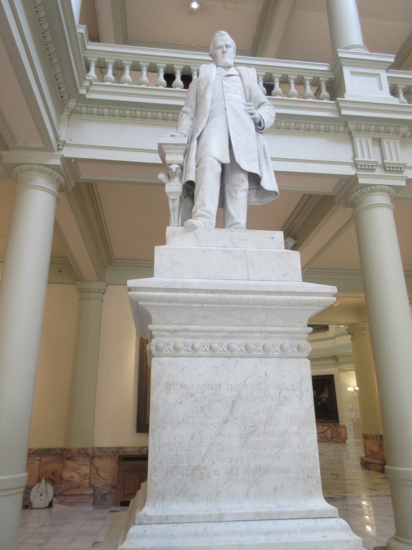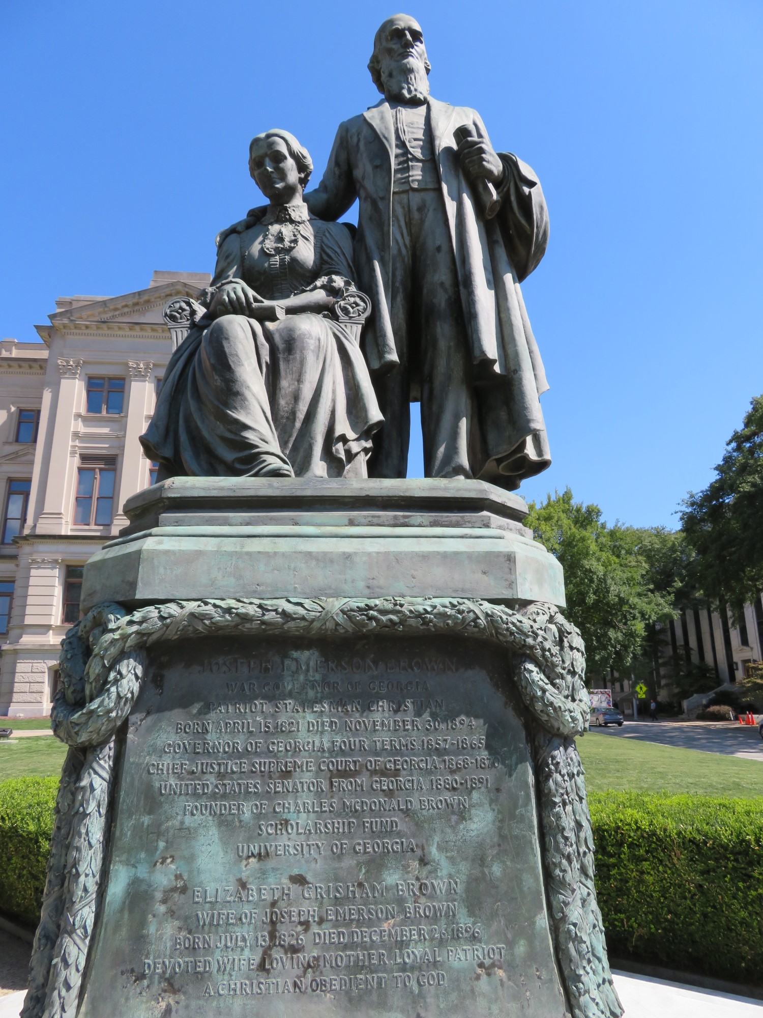 Joseph Emerson Brown (sculpted with wife Elizabeth), “War Governor” during the Civil War, the only four-term server to date. He was so into states’ rights that he began to reject Confederacy demands for Georgia’s resources in the middle of the war. Later became a millionaire after he got into the railroad biz and switched from using slaves to leasing black convicts for cheap hard labor.
