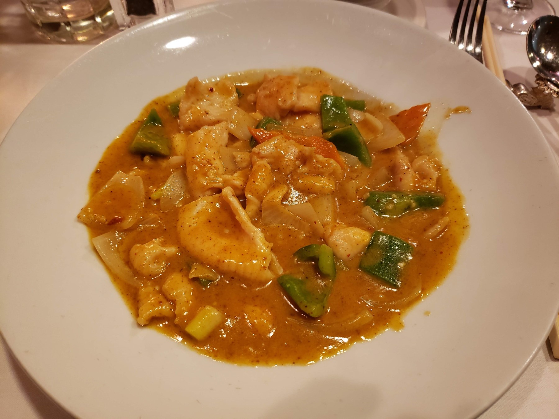 TUESDAY THE 27TH – DINNER: Their website declares themselves Hsu’s Gourmet Asian Cuisine, now celebrating thirty years of business. Their website also says T-shirts and shorts on women are prohibited. Maybe they make exceptions for Dragon Con week, but we weren’t turned away at the door. The menu contained many familiar dishes, but they aim a bit higher than the average mom-and-pop takeout joint in terms of presentation, as seen in our lead photo above.