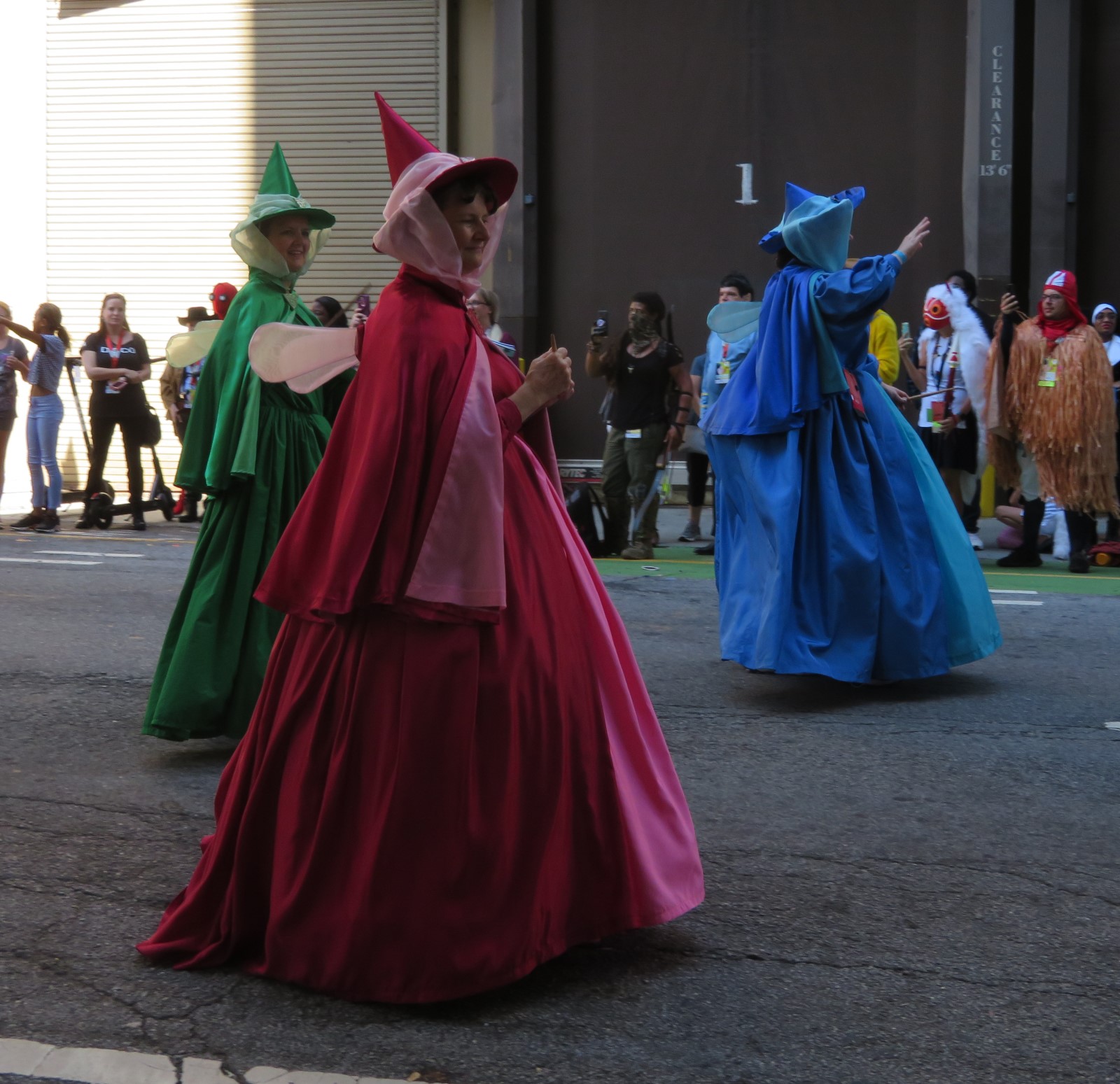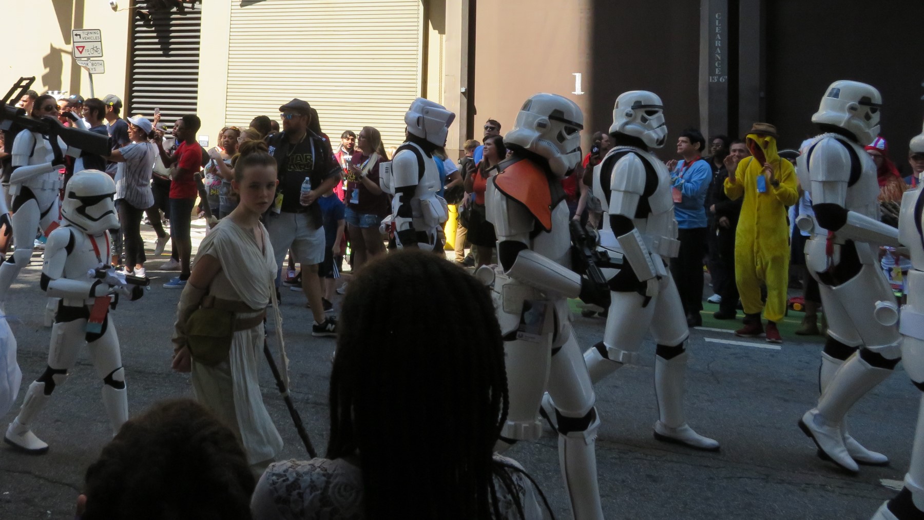 (Minor note of peevishness: in addition to cashing in on this week’s Mandalore Mania, that photo is also my clearest shot of the two individuals who, during the parade’s final twenty minutes, each decided to jump out in front of the more orderly fans who’d been in position and politely toeing the line for hours, and started adding to their Instagram stories at the expense of anyone standing behind them. Pieces of their anatomy appear in several of our photos as unwanted Easter eggs if you look closely. Triple extra credit points to any readers game enough to look back at the original chapters and spot the one photo where you can see the one lady standing on the other side of the street before she crossed over and began hogging ours. I was tempted to devote an entire entry to the matter, but decided to vent my pettiness in this paragraph instead and then, one hopes, let it go.)