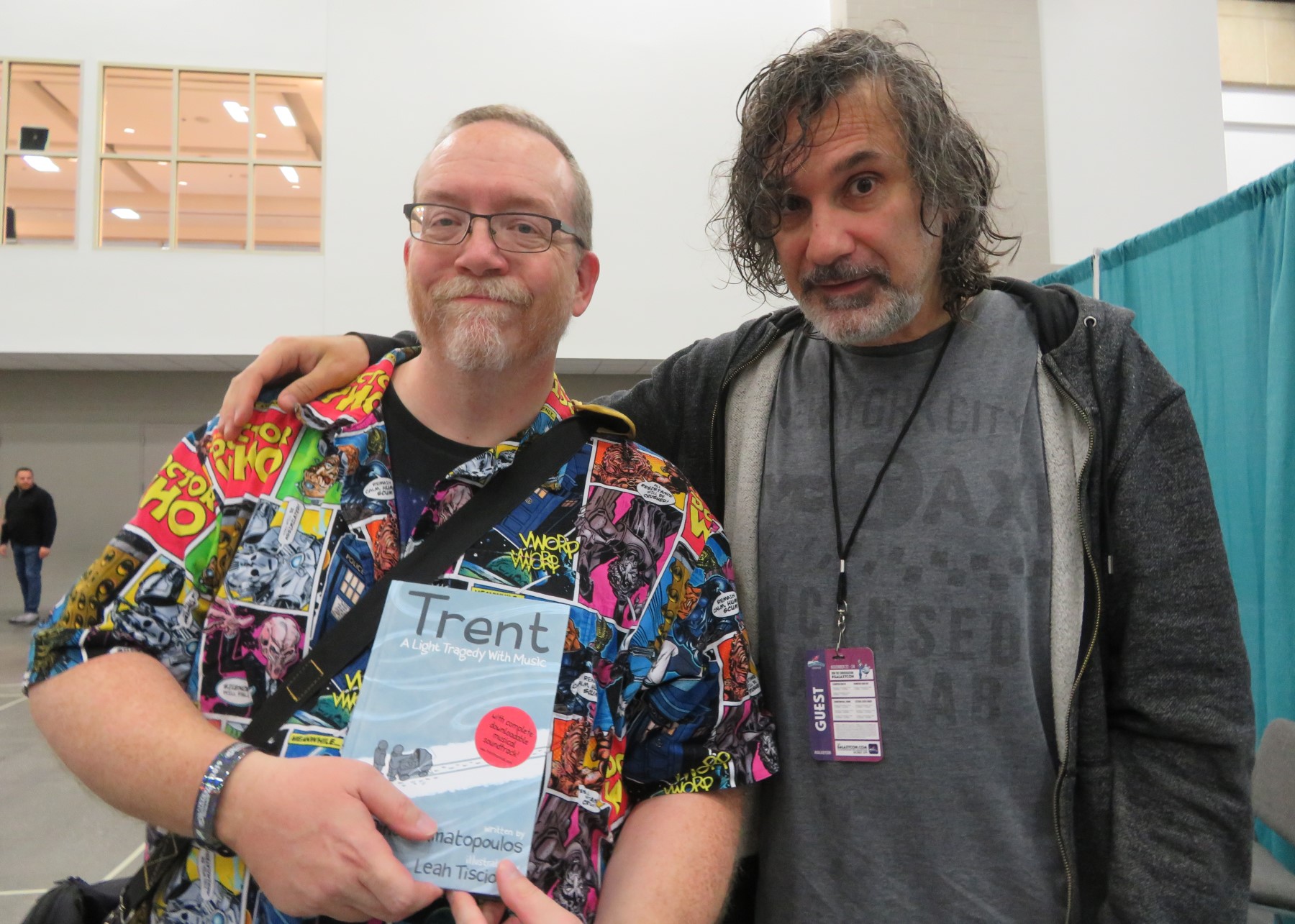 He had copies of the complete Moral Orel for sale, plus a graphic novel he wrote called Trent: A Light Tragedy with Music. To my nostalgic shock, he also brought along copies of Sorry About Everything’s 2017 album Shivers in the Cold…on glorious, old-fashioned audiocassette. I couldn’t resist buying that, my first brand new tape since Jonah Ray’s You Can’t Call Me Al went into my con bag twenty minutes earlier.