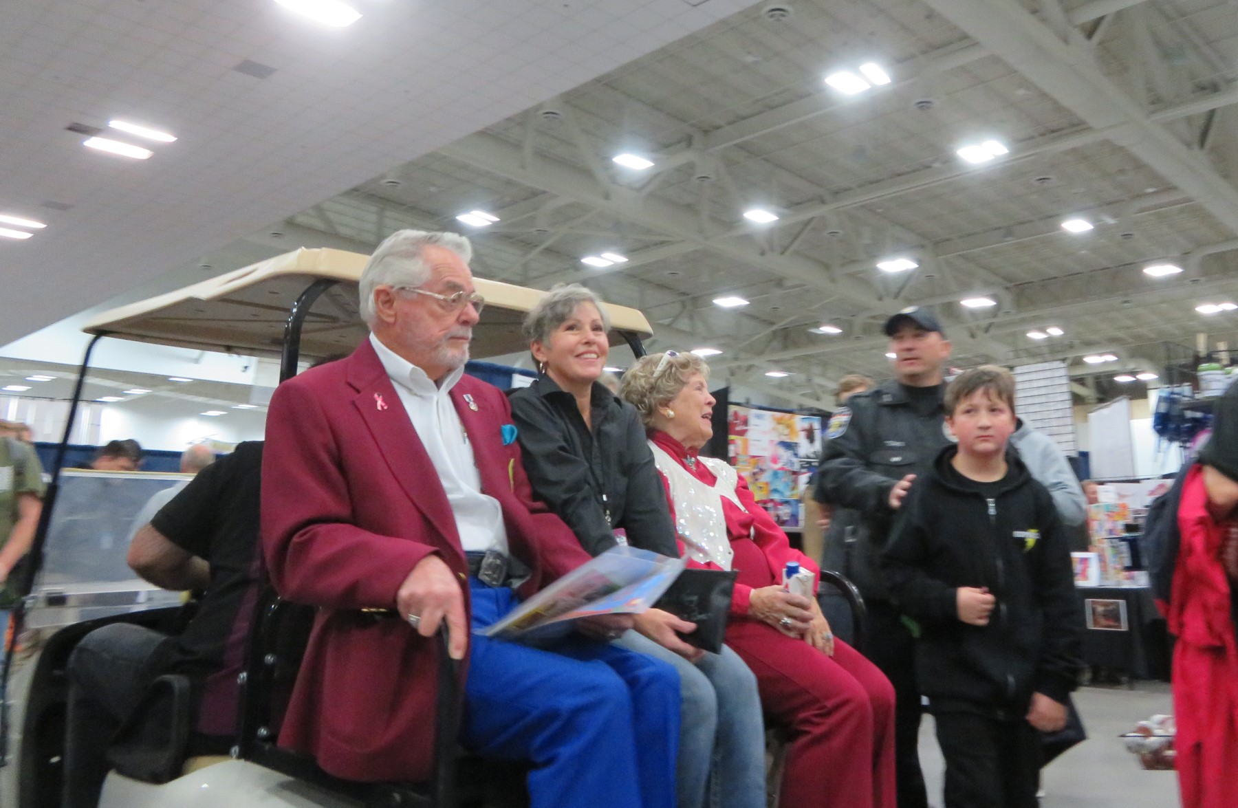 Donnie Dunagan, Amanda Bearse, and Margaret Kerry cruising by on a golf cart like it ain’t no thang.