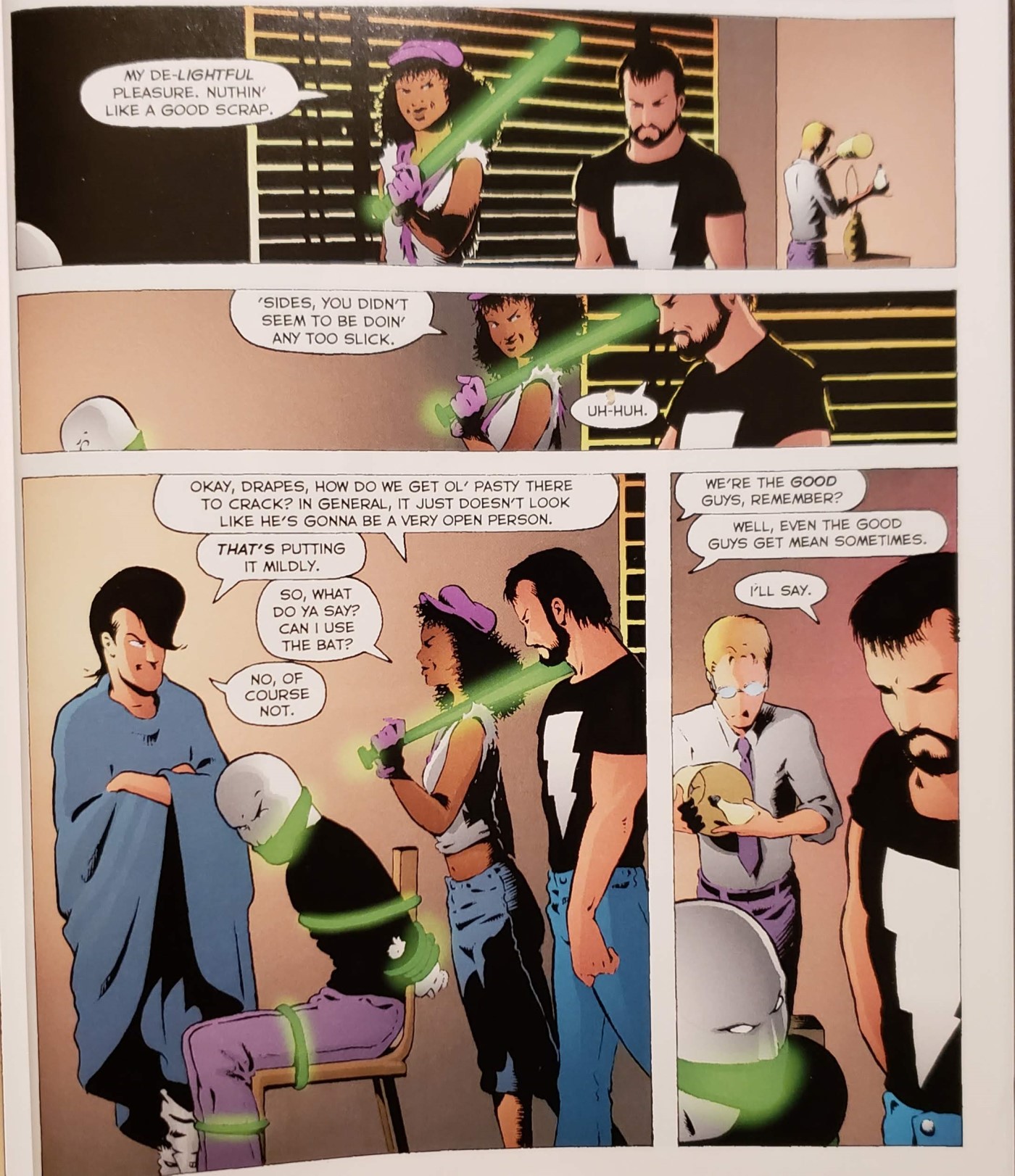 Our Hero Kevin Matchstick is an average guy in a lightning-bolt T-shirt introduced to a whole new world of fantasy when a cagey wizard named Mirth awakens superpowers within him and minutes later has him chasing down inhuman henchmen from another dimension. Along for the ride is a black teenage girl nicknamed Edsel, who wields an enchanted baseball bat and who presaged the current tidal wave of kickbutt nonwhite women saving the day in genre comics. Wagner at the time was a young artist coming into his own with a rounded style that stood out from the pack, riffing faintly on King Arthur but building his own world with its own rules. (He’s been in the biz long enough that his son Brennan is now collaborating with him on new Grendel stories. I feel so, so old.) Hopefully it won’t be another twenty years before I can stumble across Volume 2.