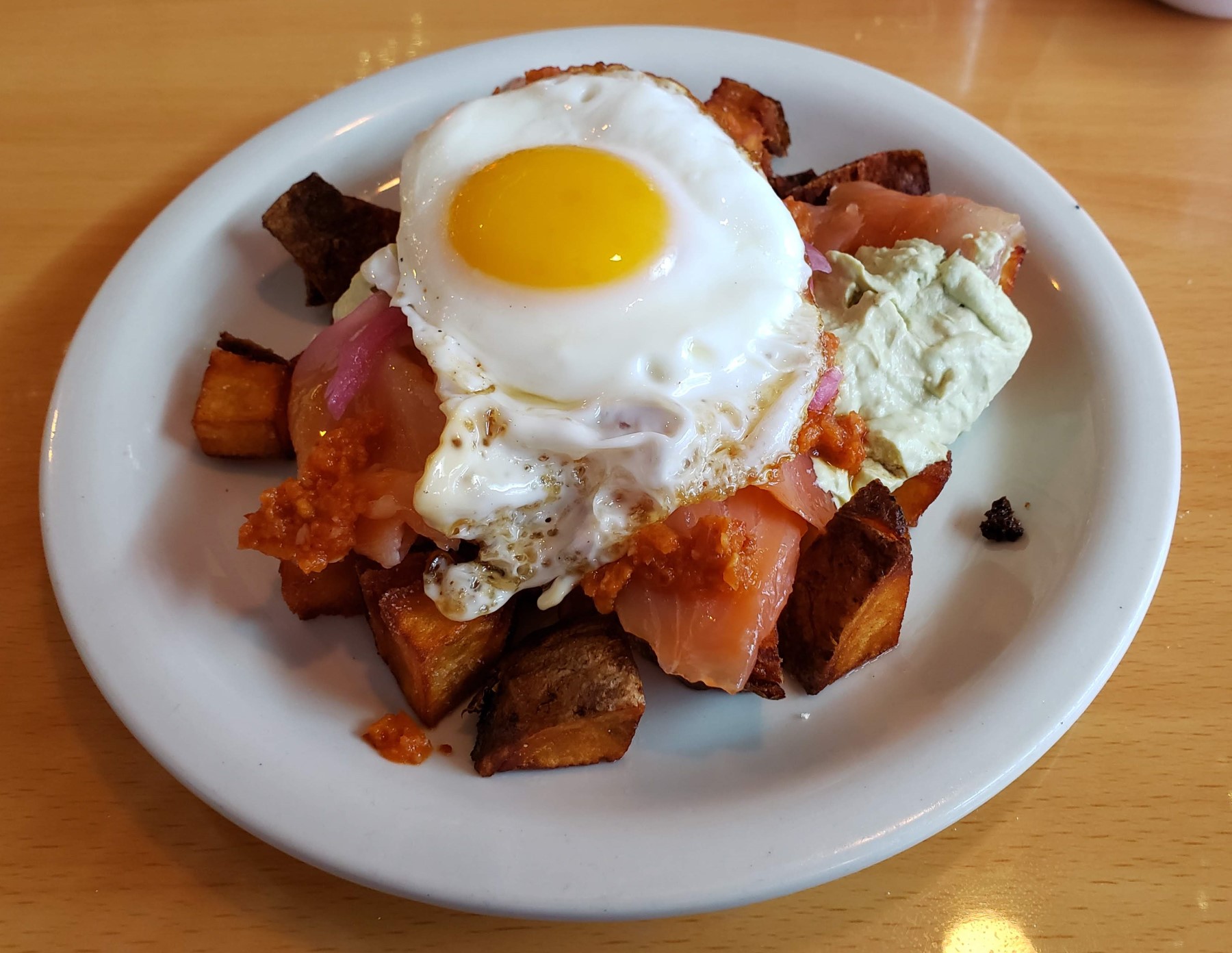 My meal of choice: Lox Home Fries — potatoes, cured salmon, pickled red onion, avocado crema, and salsa roja topped with a fried egg.
