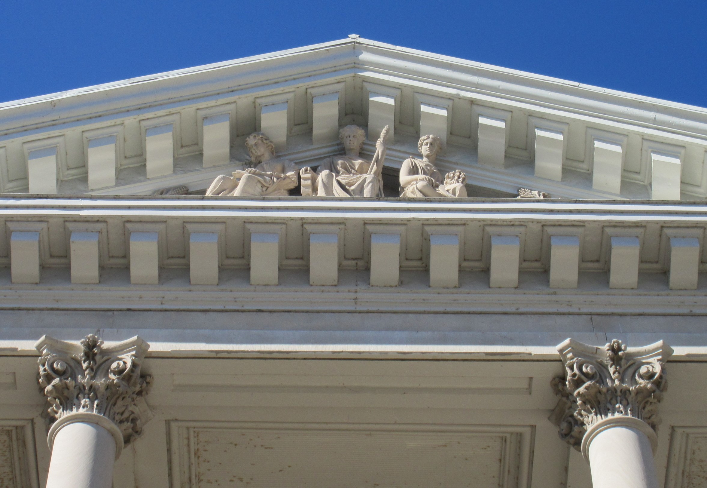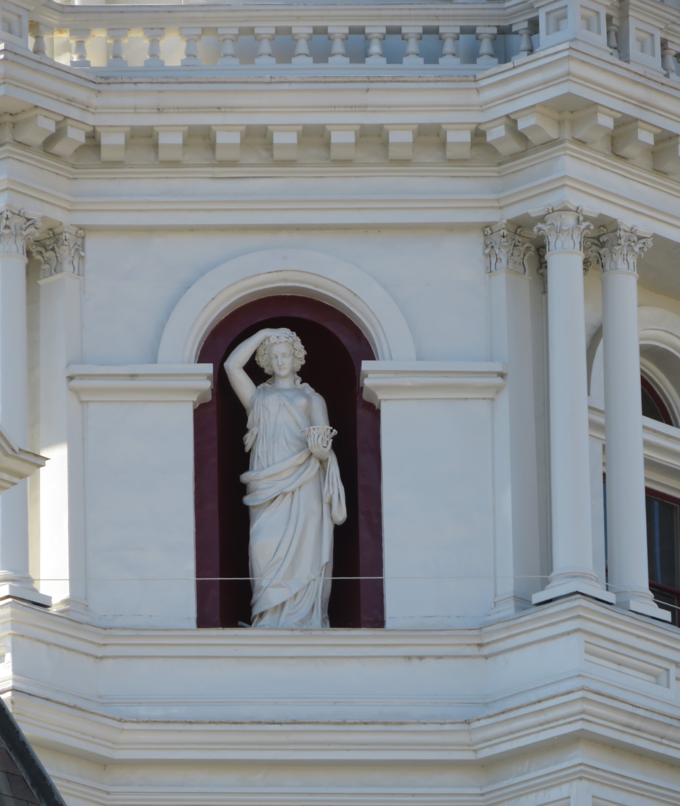 On the opposite side of the Courthouse from the Washington pediment, peering down upon us from a second pediment are Justice,, Industry/Education, and Agriculture. The architects did love their goddesses.