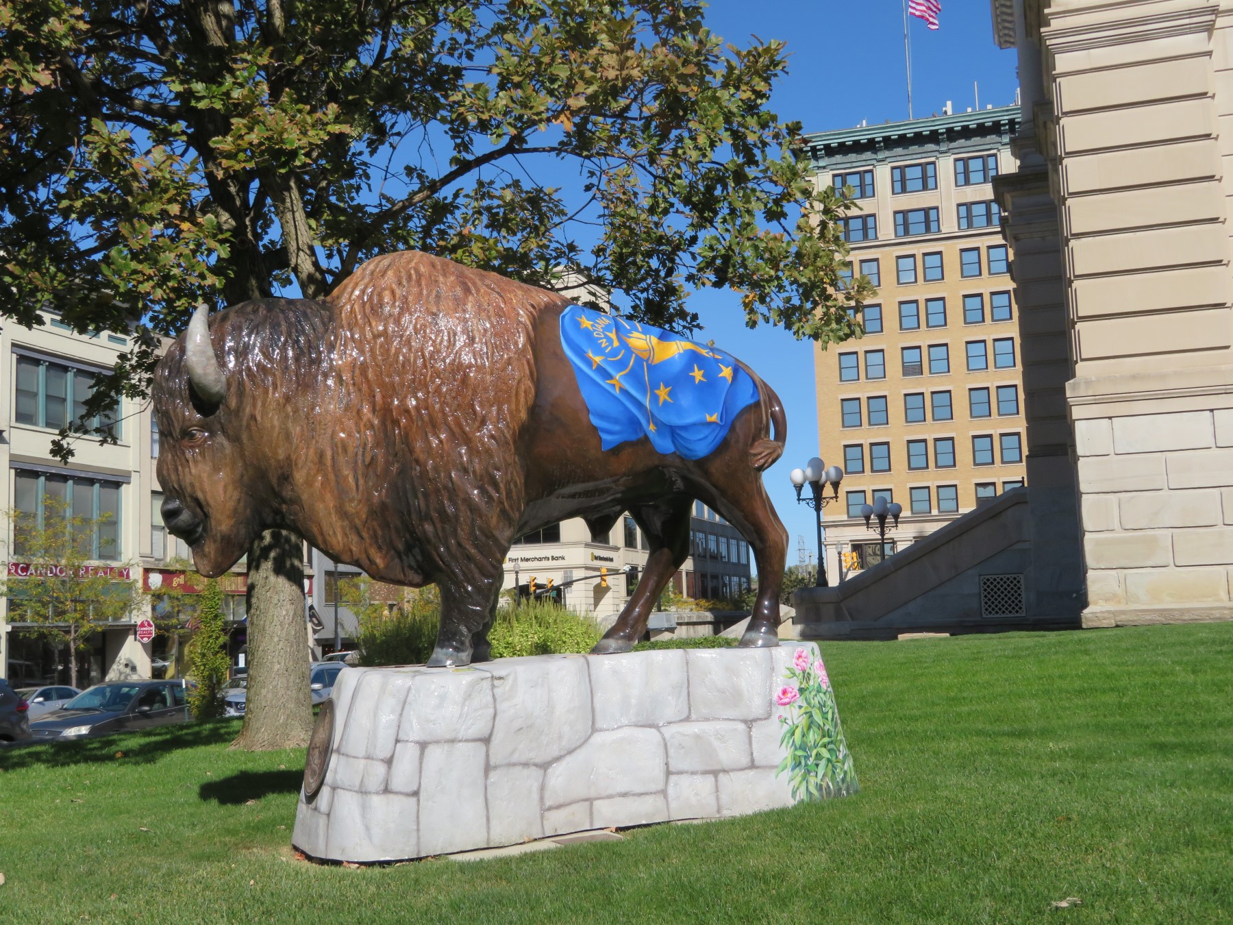 One of the Tippecanoe County Bicentennial Bison stands guard, remembering that time the state of Indiana turned 200 years old.
