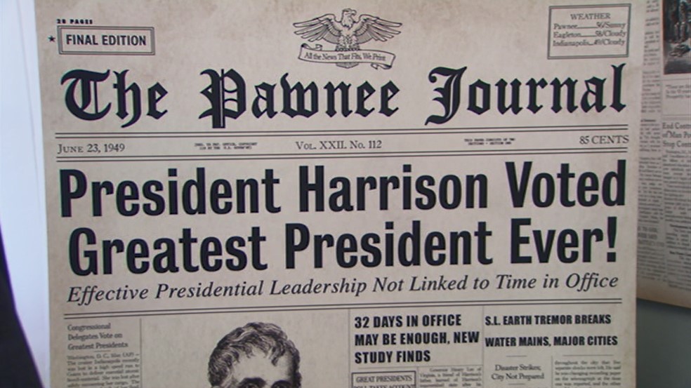 …and season 7’s “William Henry Harrison”, in which Leslie, Andy and April visit a museum that devotes itself to Harrison’s life but struggles to make relevant use of all its exhibit space. (Though the show fictionalizes its contents, Indiana does have a Harrison Mansion and Museum down in Vincennes. We’ve not visited it yet, but we’ve been to his gravesite in Ohio.)