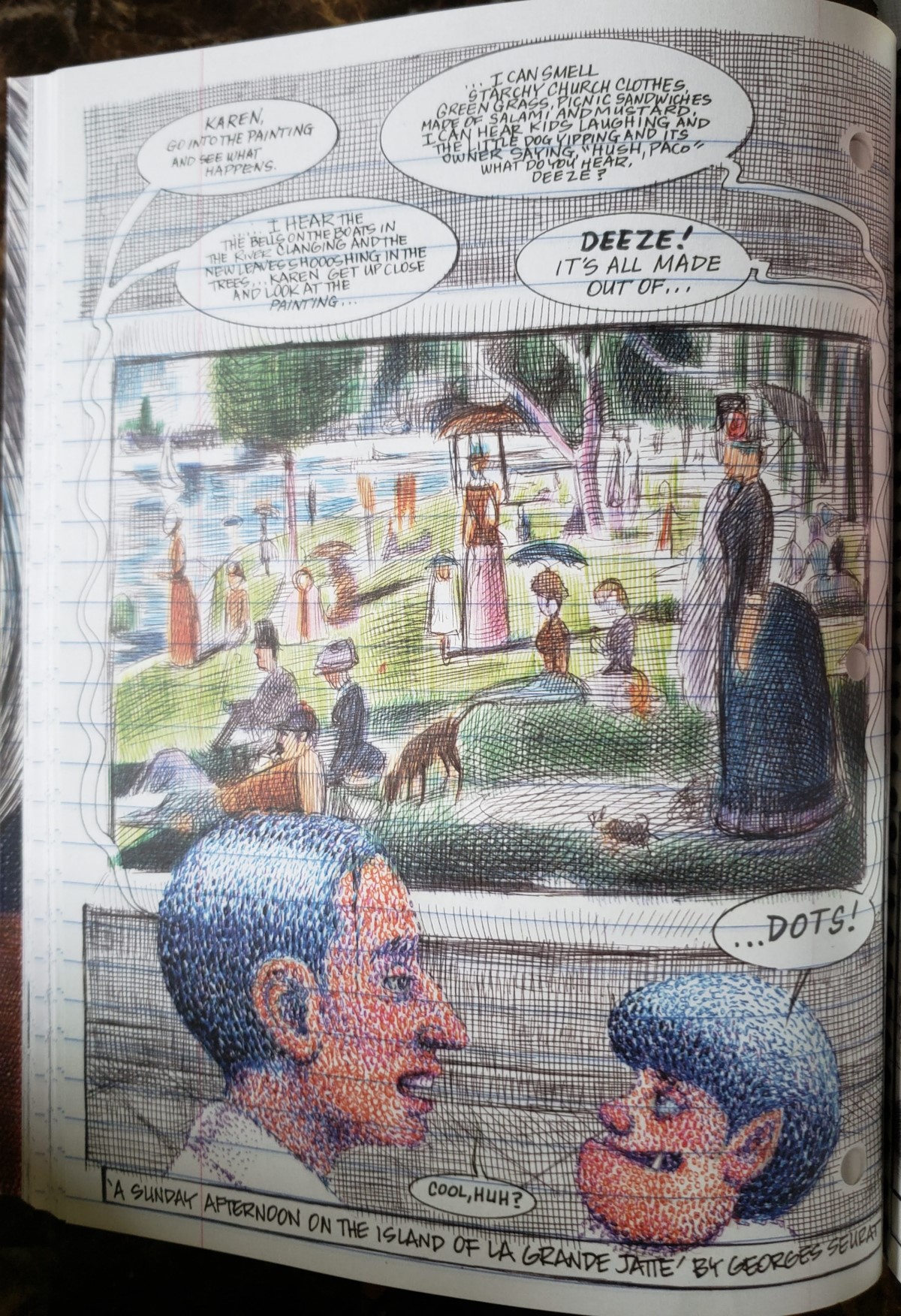 At the risk of crossing the meta-streams, I had to share a bit of one scene where main character Karen and her big brother Deeze visit the Art Institute themselves. Gotta love that Seurat and his lovely Sunday afternoon.