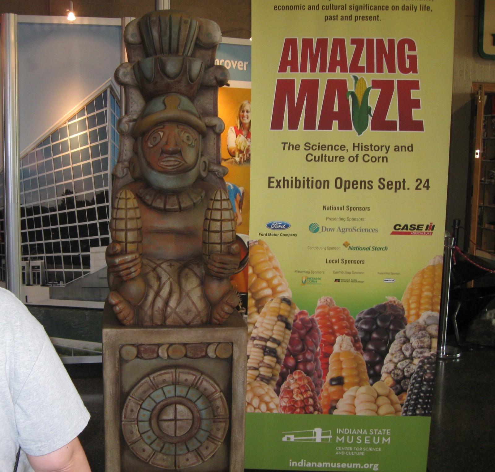 A corn maze god appears on behalf of an Indiana State Museum exhibit. Pay no attention to troublesome documentaries such as King Corn or Food, Inc. that malign his most holy reputation.