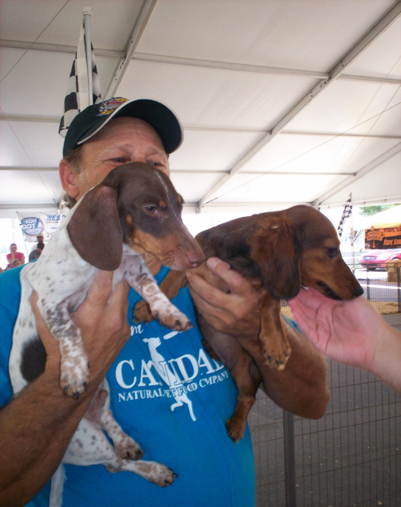 Racing wiener dogs, awaiting their adoring fans after running a “Fido 500”.