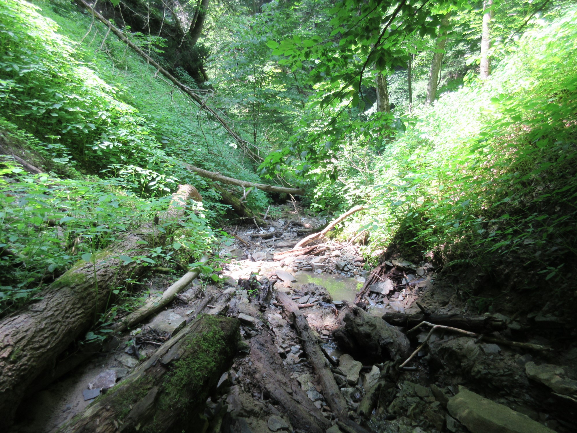 When we reviewed the park map, I noticed Trail #2 seemed to have more sights marked on it than the other trails. It was labeled “rugged/very rugged” at an estimated length of 1.25 miles. We’ve done rugged trails before. At our favorite Indiana park, Turkey Run (only five miles southwest of Shades), we’re accustomed to traversing their famous Trail 3, which is so rugged it has ladders at one point. We figured if we could handle that classic, how bad could Shades’ Trail #2, whose special features included something called Pearl Ravine?