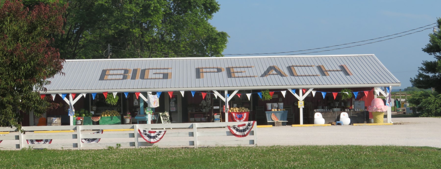 I wish the anecdote kept going, but we arrived while the market was still closed. Once we had our photos of Anne and the giant peach, we returned to the car and headed back to the main road, whereupon of course a few employees began to arrive for their shifts and unlocked the gate. We didn’t want to loiter and pester them until they clocked in, and I wasn’t sure it was a good idea to buy fresh groceries that would sit and bake in the car for the next several hours while we did more tourism down in Vincennes. Maybe next time we’re in the area, we can time our visit a little better and bring a cooler.