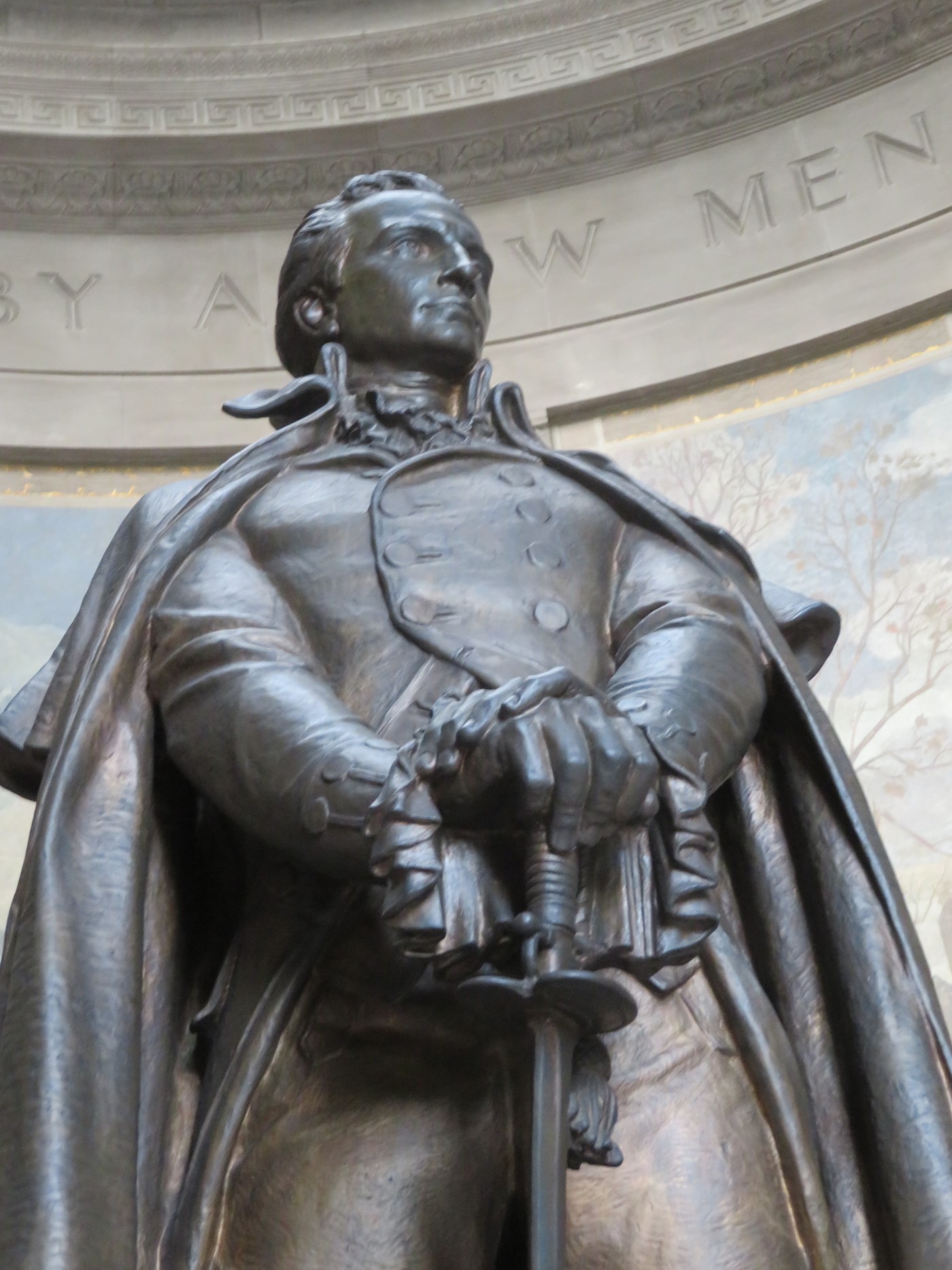 The public-access portion of the monument’s interior is a single rotunda with a 7½-foot statue of Clark standing in the middle, as shown in our lead photo. On the walls are seven murals by painter Ezra Winter depicting events from his Revolution travels in chronological order, each captioned thusly: