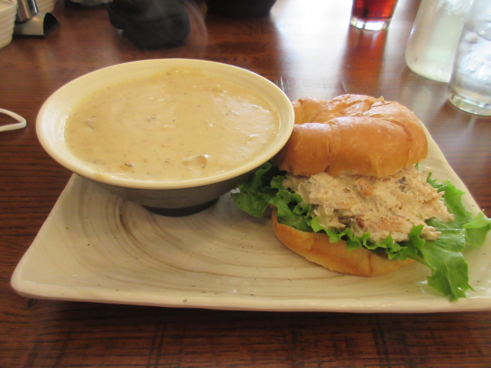 As for me: the Cashew Raisin Chicken Salad sandwich on croissant with Dijon mustard and a bowl of crab chowder. Looks standard, tastes magnifico.
