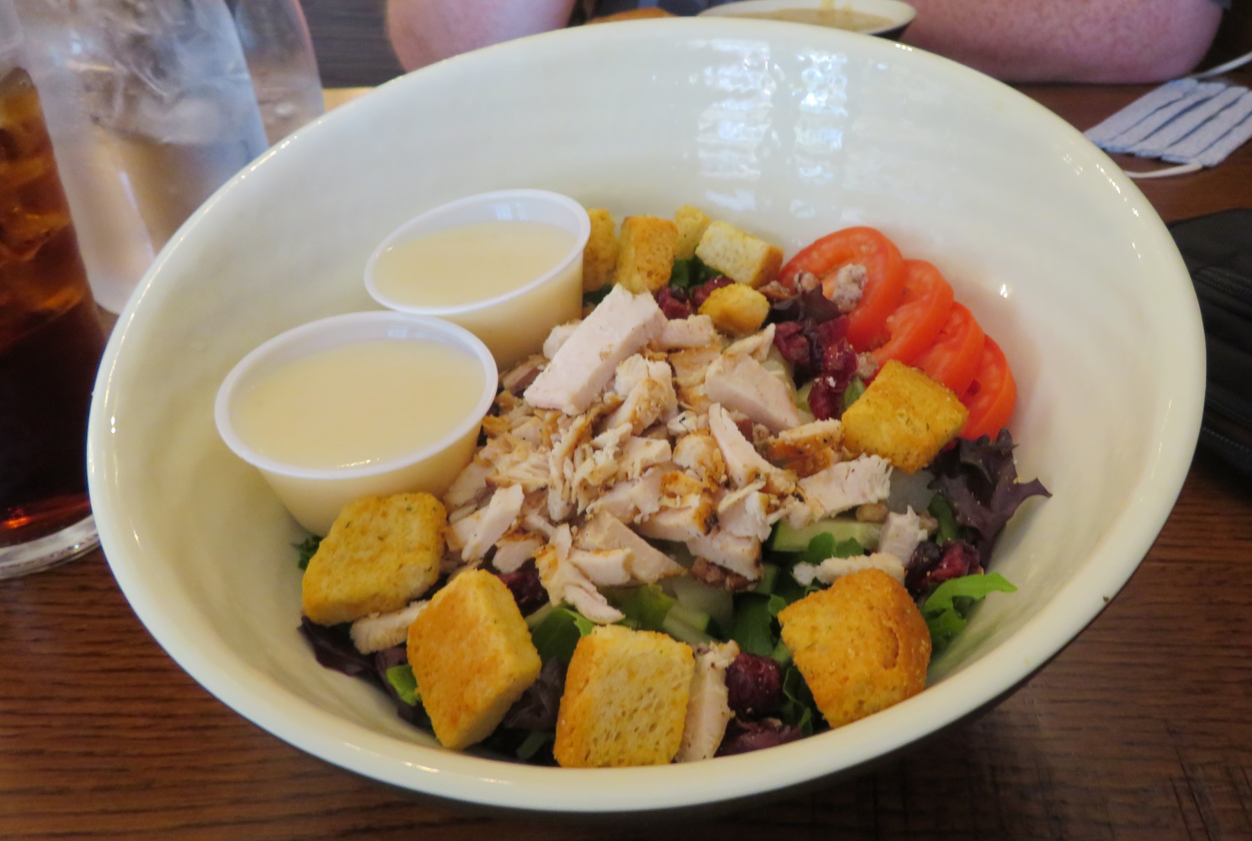 Anne’s choice was the Pear and Pecan Salad topped with cranberries, candied pecans, and feta cheese. It’d look more distinctive if she hadn’t paid extra to have it smothered in grilled chicken, but at least you can see the pear vinaigrette dressing.