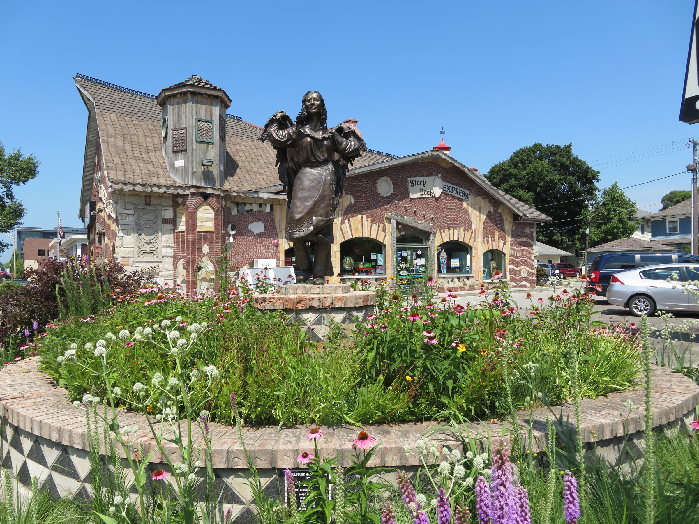 Rather than an incredible insect, their corner sentinel is a bronze maiden sculpted in 2009 by a Miami Nation artist named Manetoowa.