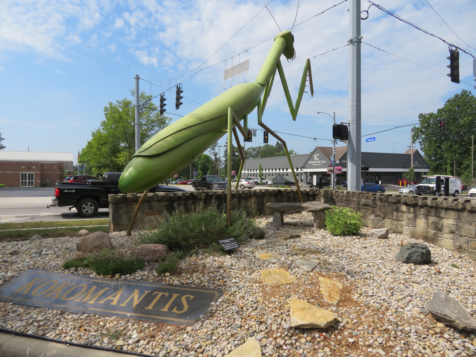 Deep in the heart of Kokomo stands our lead subject: the amazing colossal KokoMantis! 17 feet up and 22 feet long, the brainchild of Scott Pilcher and Scott Little was erected in 2012 using a combination of parts taken from stoplight poles and a WWII bomber. He spends his days guarding a Subway parking lot and generally threatening anyone who approaches with any attitude less than puzzled respect.