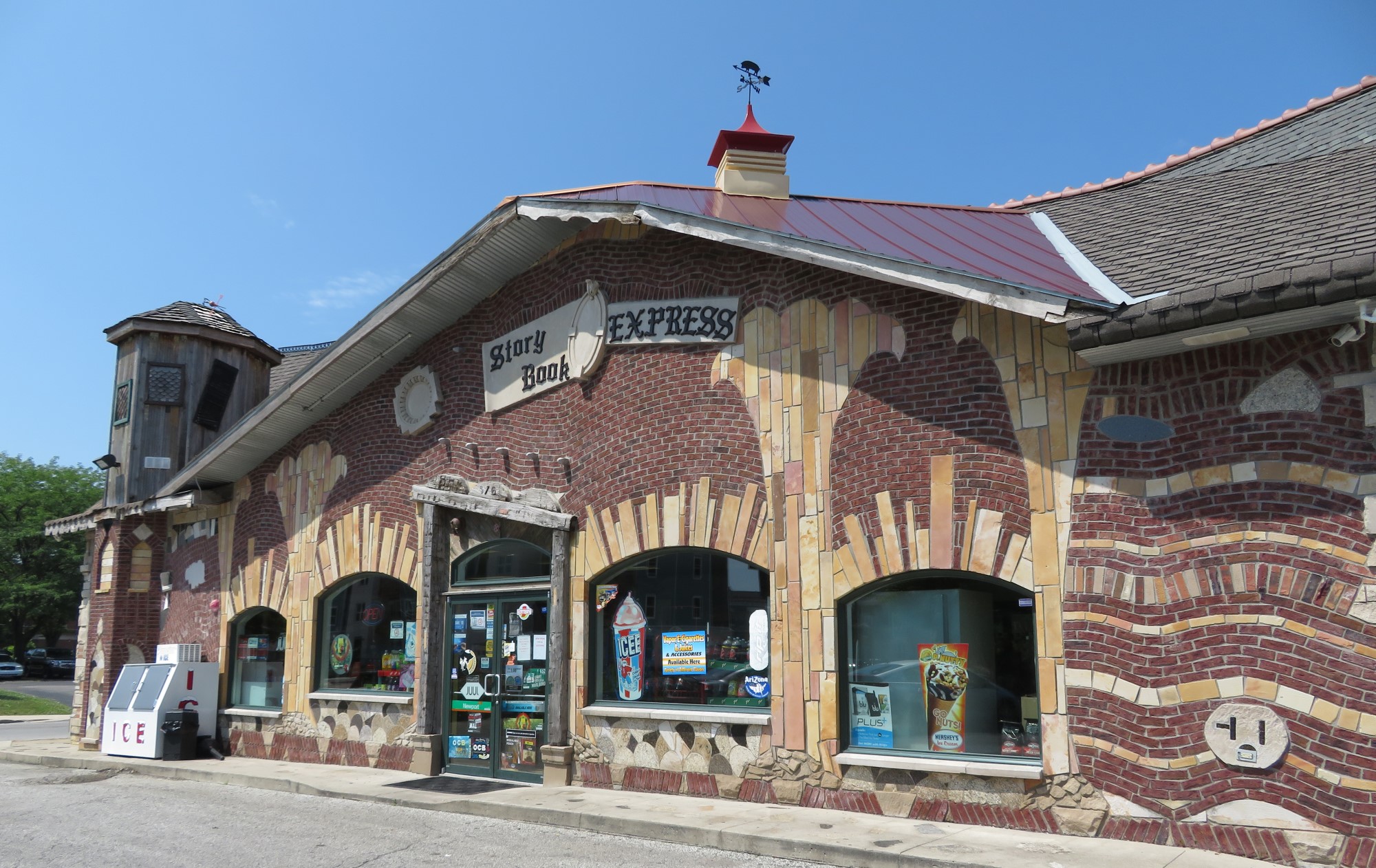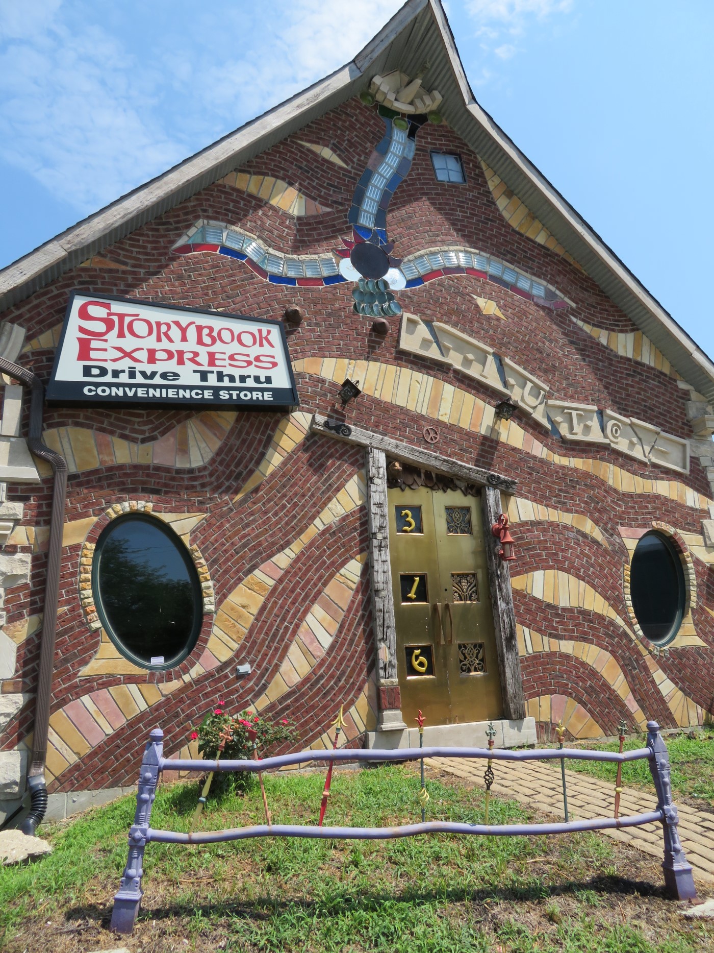 Two minutes east of KokoMantis on Sycamore Street is another unusual structure, likewise constructed in 2012 from repurposed parts, overseen by Mr. Pilcher, and seemingly warped into our reality from another realm. For practical purposes Storybook Express is an ordinary convenience store, but it’s bolder on the outside. Its components came from an old local firehouse as well as several schoolhouses from around Indiana.