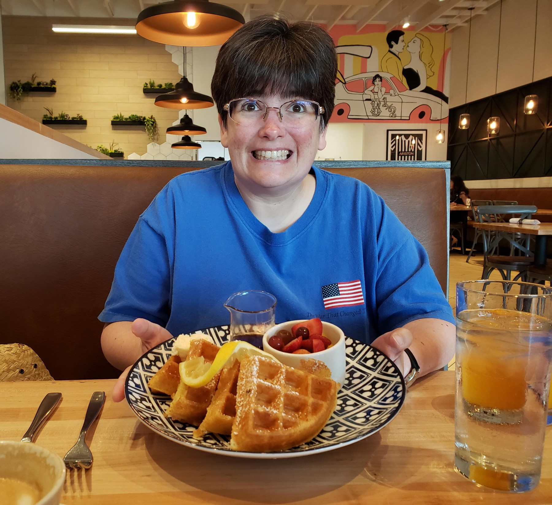 No mere waffles, those. Anne is enjoying their lemon mascarpone waffles. Adjectival ingredients make all the difference.