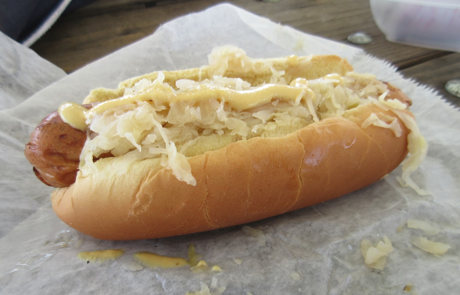 While Anne grabbed a fried fish sandwich, among her street-fair favorites, I whetted my remaining appetite with a standard carnival bratwurst topped with hot mustard and sauerkraut. It’d been a long, long time since I last spotted one of these in the wild.