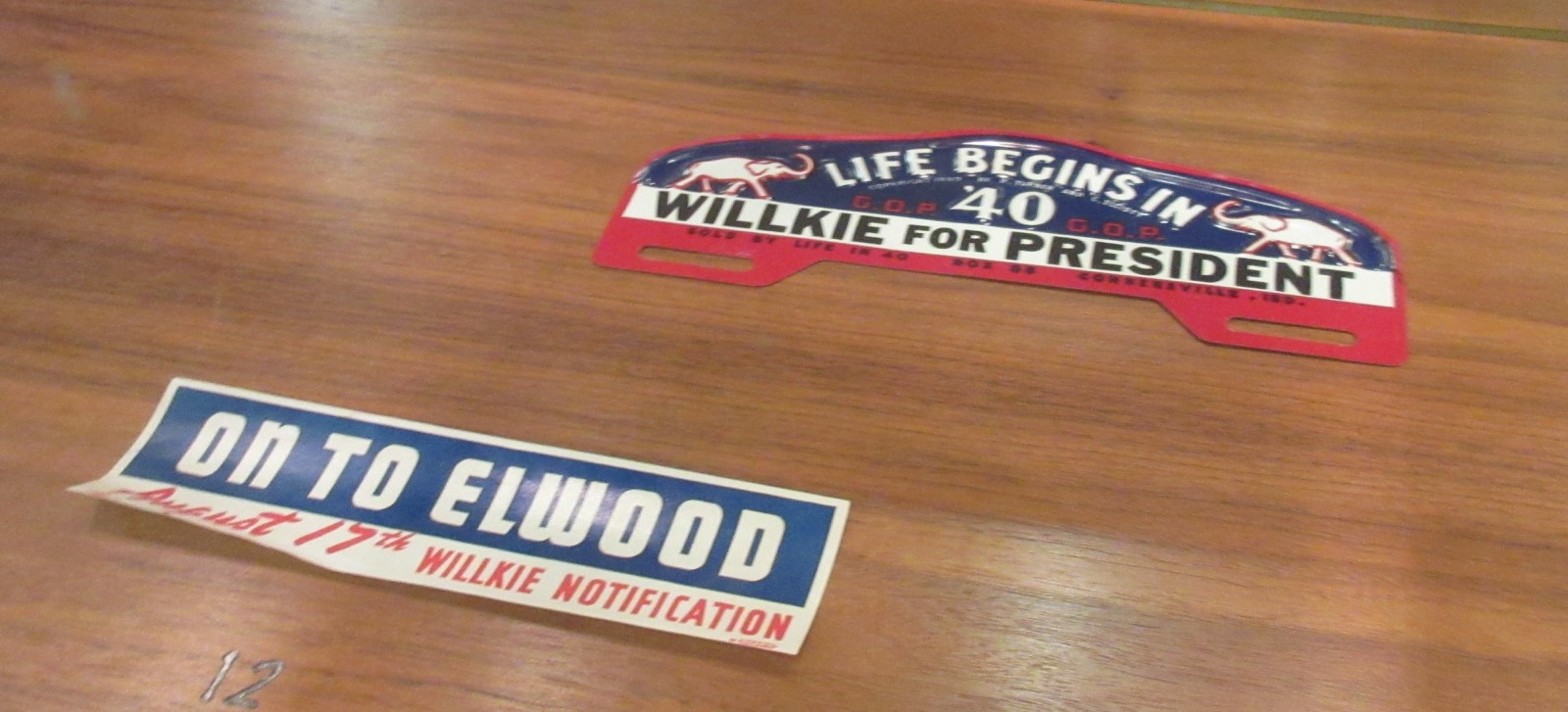 Campaign stickers for Indiana’s own Wendell Wilkie, who was born and raised in nearby Elwood, and who ran against FDR in the 1940 Presidential election.