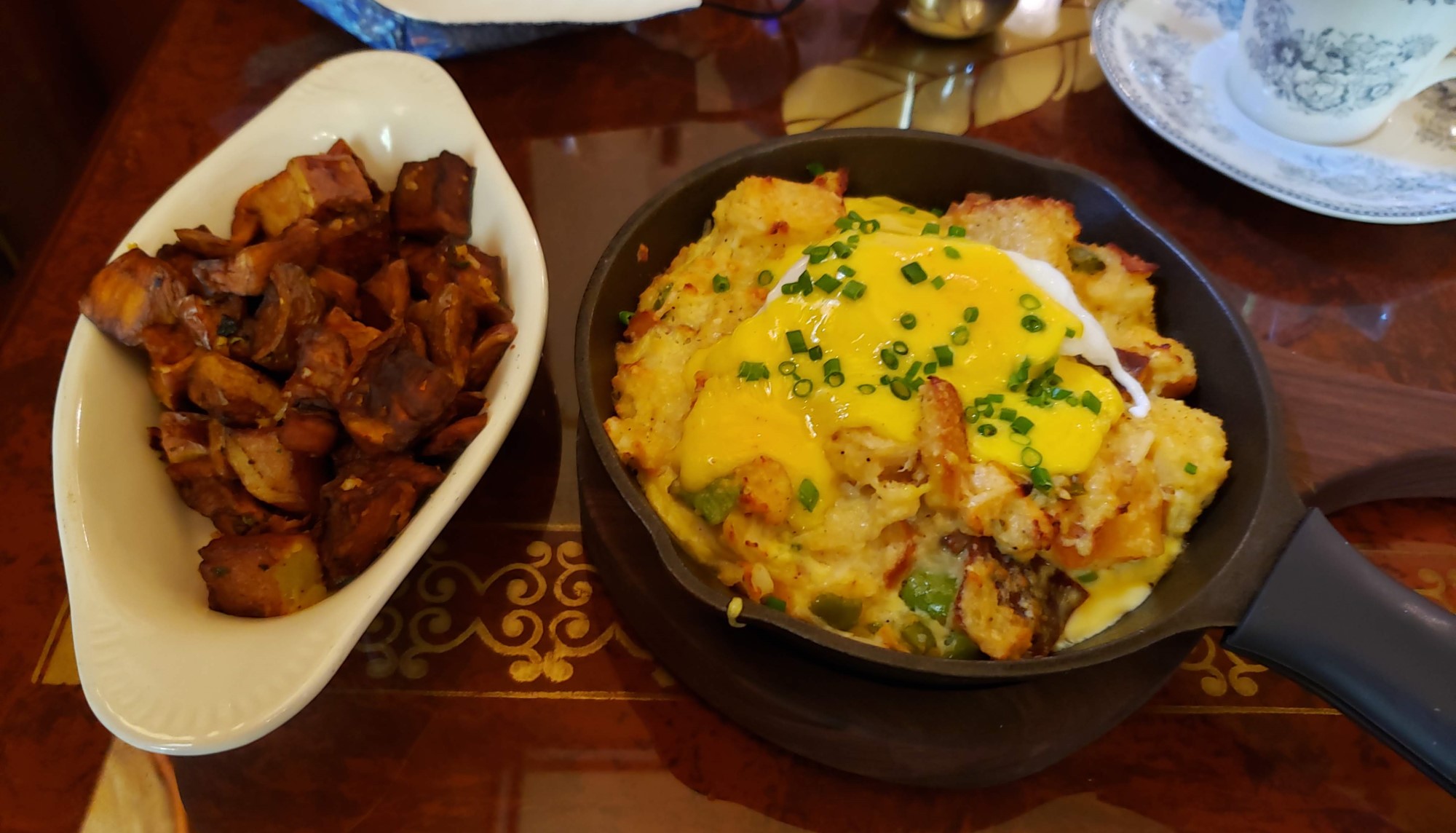 For me, the Crab and Bacon Strata topped with Hollandaise and a poached egg, served with home fries.