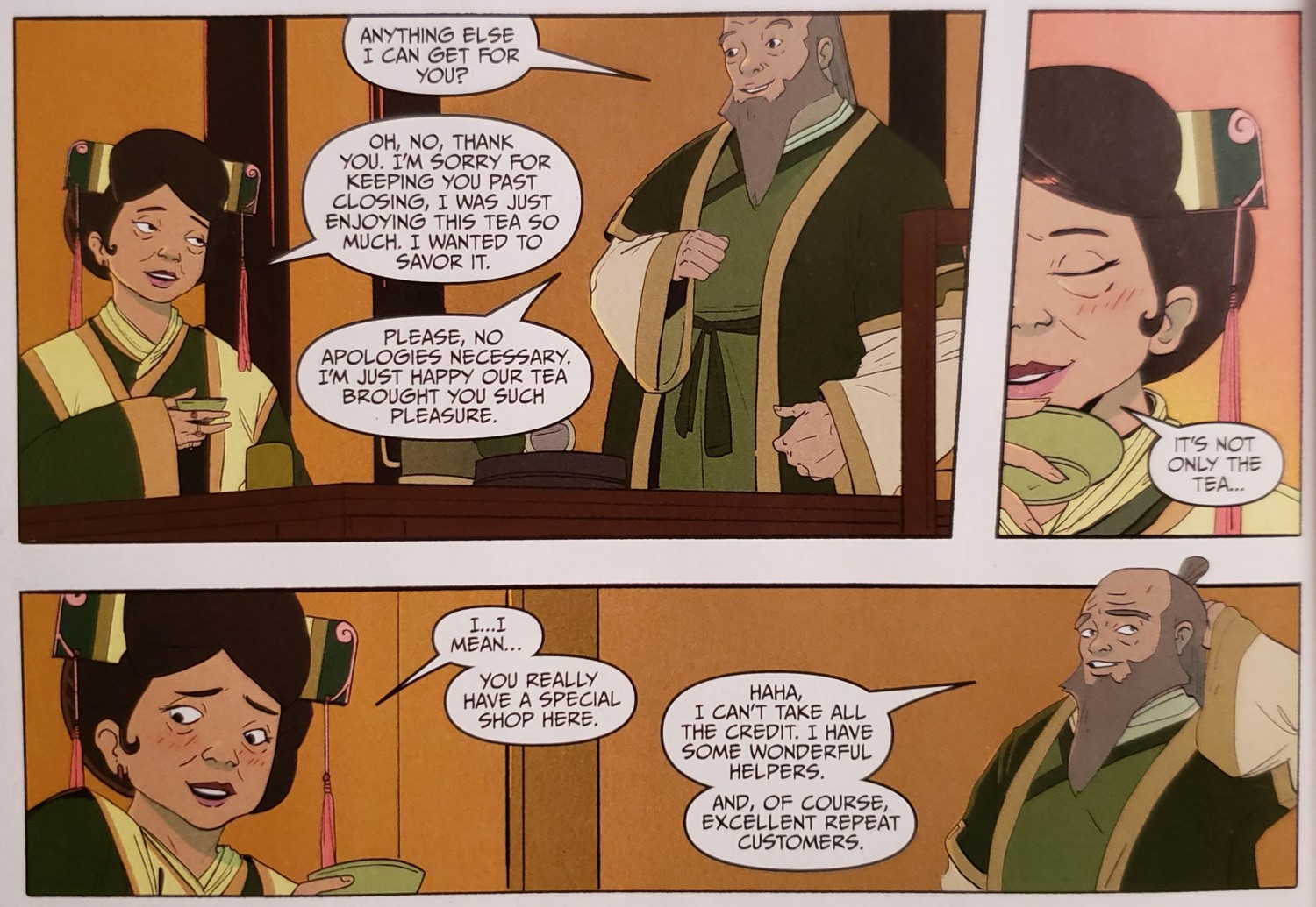 As an old softie I was more enchanted by the second story, an “Avatar” trifle in which some sensei-ish restaurateur named Iroh (he’s…someone, I’m guessing?) remarks on how he pretty much has every bit of happiness he could want from this life, all while he fails to notice the overly kindly overtures from a woman his age who has quietly become his best customer. Old-fashioned romance comics, should they exist, never seem to appear within 100 miles of me, so perhaps it’s that scarcity and the cast’s ages that makes this all the more adorable. After all, sometimes the man who thinks he “has” everything may simply not be paying attention. And if you can live long enough to get an ‘A’ out of life, why not heed the call when life suggests you could go for an A-plus?