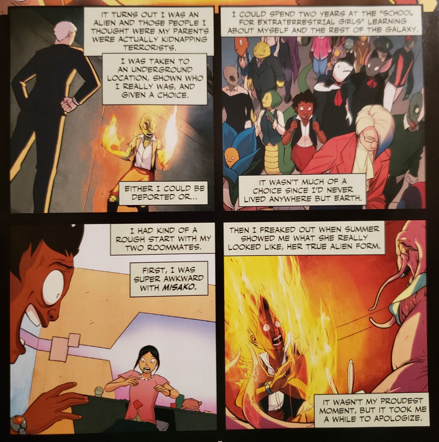 4. School for Extraterrestrial Girls (Papercutz) – Jeremy Whitley, creator of Princeless and writer of the underrated Unstoppable Wasp, joins forces with artist Jamie Noguchi (Yellow Peril) to assemble yet another team of diversely complicated teen power-girls. This time they’re aliens consigned to space boarding school, learning to navigate their own hangups as well as each other’s, and of course misadventure ensues. This intermission recaps their first volume and sets the stage for their relocation to a new setting in the next volume, this time with boys in it, who will probably ruin everything because, well, boys being boys, exactly as I remember boyhood. New readers are brought up to speed quickly and sympathetically, while anyone who benefits from repetitiveness as a learning tool can refer to each character’s dossier in the back pages, 95% of whose data was already covered in-story.