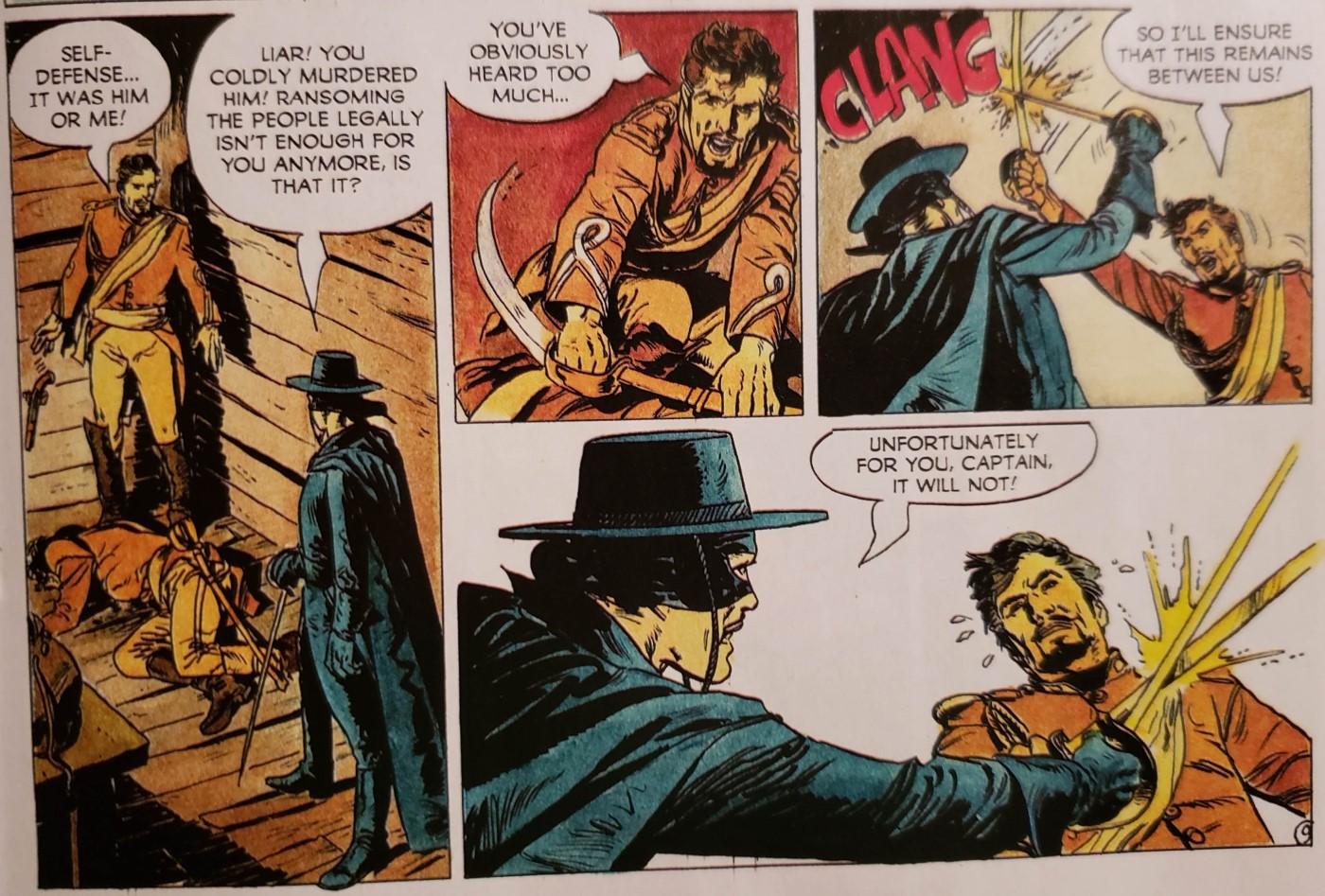 Also included are four unlettered, uncolored art pages from an upcoming Zorro project to be written by Don McGregor, best known as a top contributor to the world of Black Panther back in the ’70s and ’80s. Having read some of those tales way back when, I look at these decent-so-far, action-packed pages by Vincenzo Carratu and I have to wonder where they’re going to cram in all those 300-word captions.