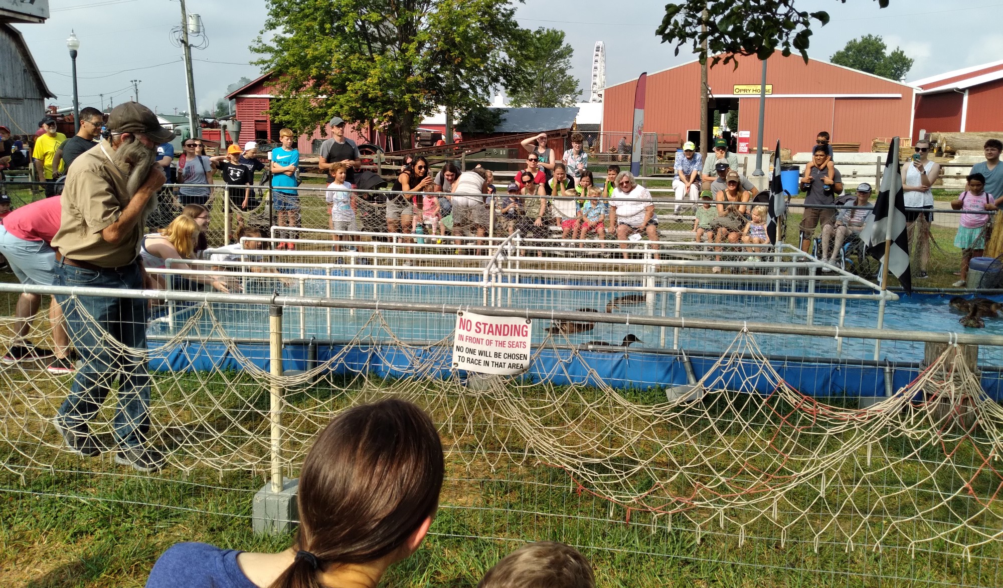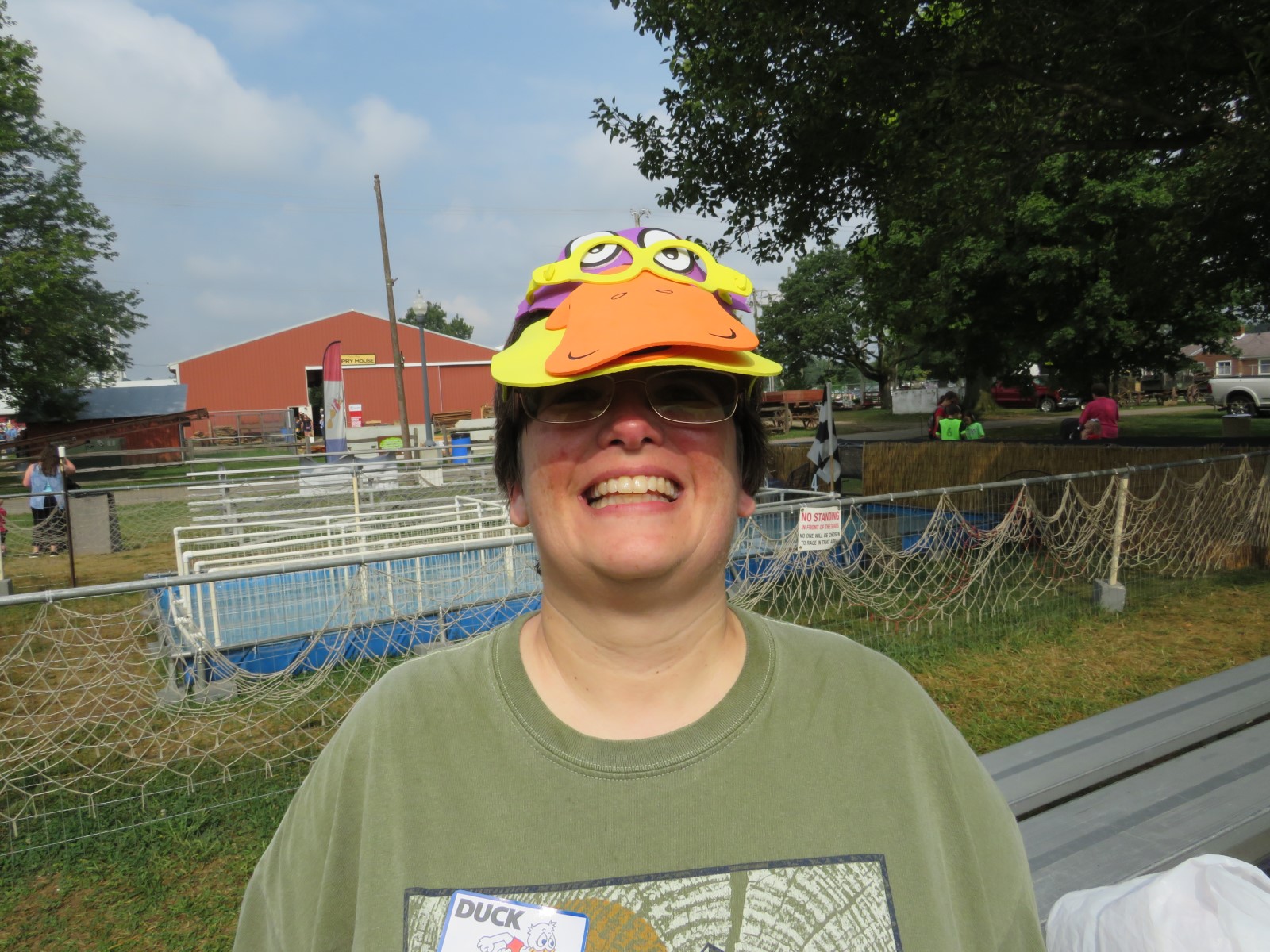 Anne’s duck sadly did not win, but at least she tried. After the entire rinky-dink regatta was over in less than fifteen minutes, the audience was naturally invited to come buy Great American Duck Race merchandise — duck-calling noisemakers and so forth. Seized by a sudden urge for a souvenir from her sports experience, Anne bought herself a hat and wore it around the fairgrounds for the entire rest of the day with pride. This sparked a fun conversation with one food vendor who recognized the trophy of a fellow veteran duck racer with whom they could swap duck tales.