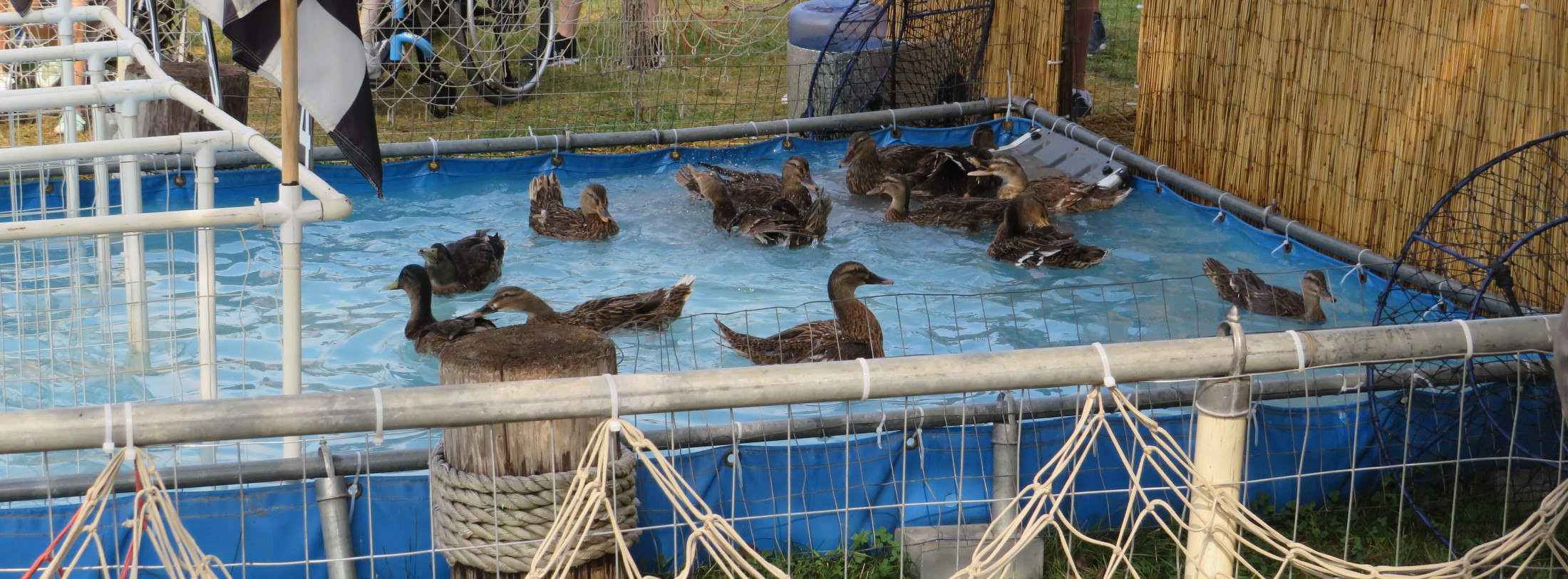 I was a little surprised when Mr. Duck called for volunteers and Anne raised her hand. It was an early Thursday morning, the small bleachers were half full, and she was struck by a whim to switch gears from passive to active. She was handed a duck from the staging pen and approached the starting line. According to her, the duck was very light and soft, and required a confident grip but not a cruel choke-hold. Of the four races run that morning, only two human entrants lost control of their charges, thankfully both into the water rather than out into the crowd.