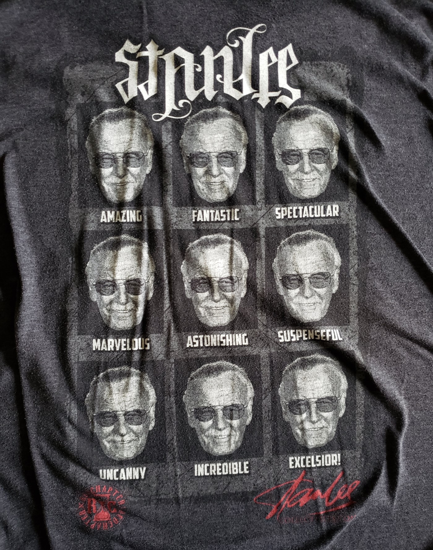 A Stan Lee souvenir shirt I bought from that same Cincinnati con, featuring his face and his favorite descriptors. A few of these have taken on new applications.
