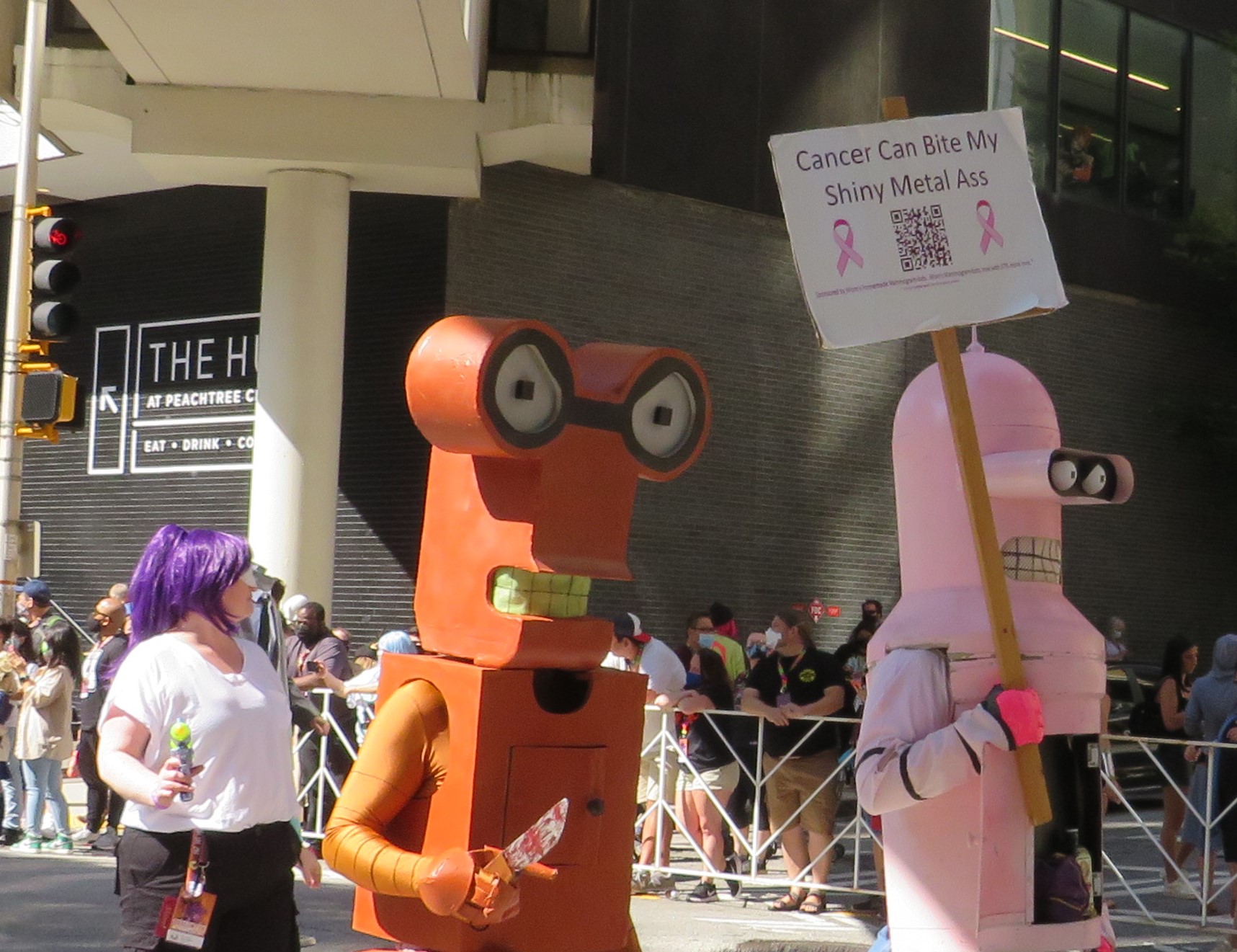 Futurama was the final pop culture group of the parade, here featuring Leela, Roberto, and an anti-cancer Bender.