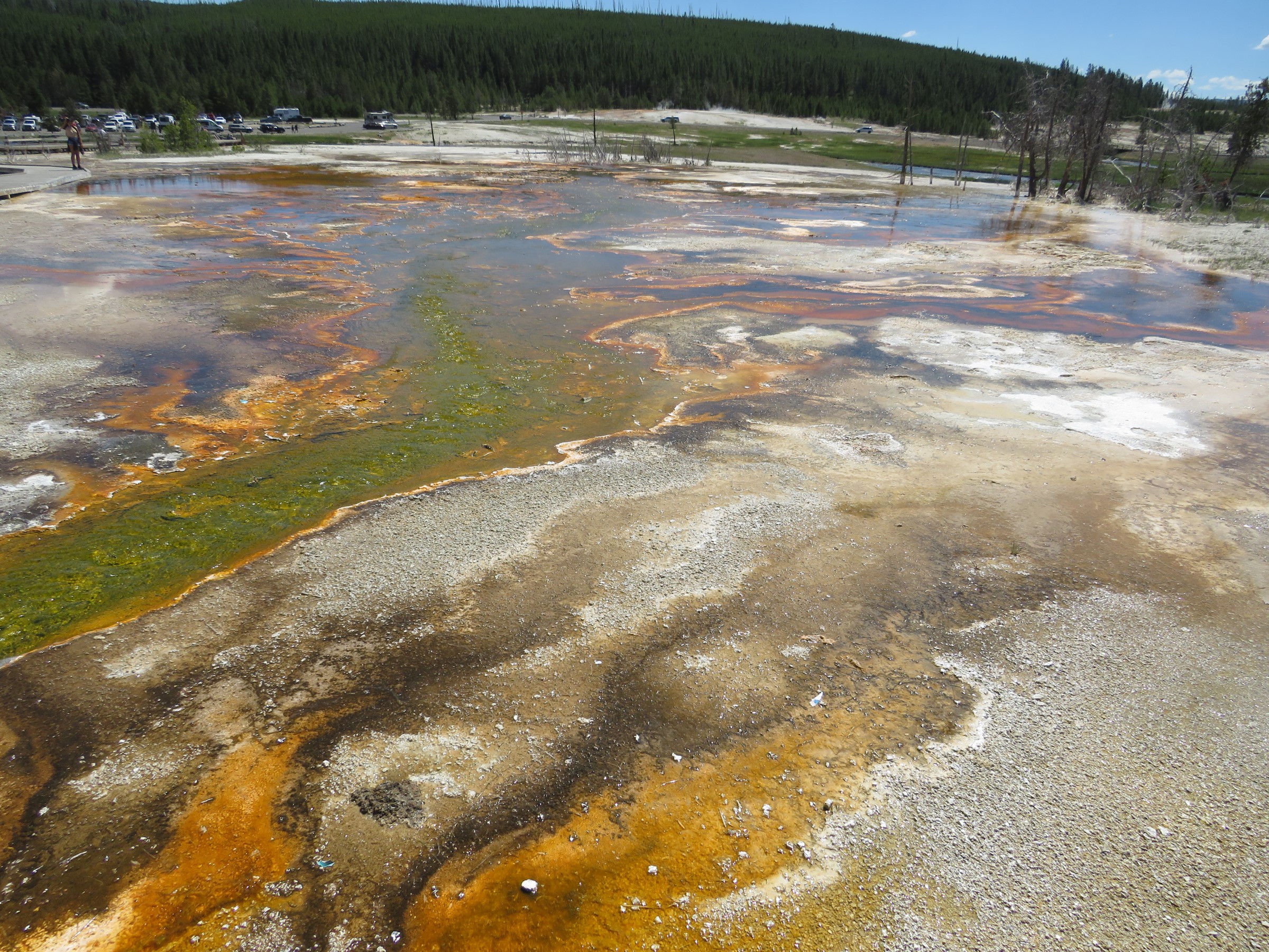 Sure, Old Faithful was spiffy, but every ounce of its spewed hot water was the same ordinary color. Elsewhere in Yellowstone, organic and inorganic additives commingle in the waters to produce scintillating effects in multiple colors of the rainbow. Maybe not all of them, but quite a few. I wouldn’t have minded some purple, but the land wasn’t taking requests.