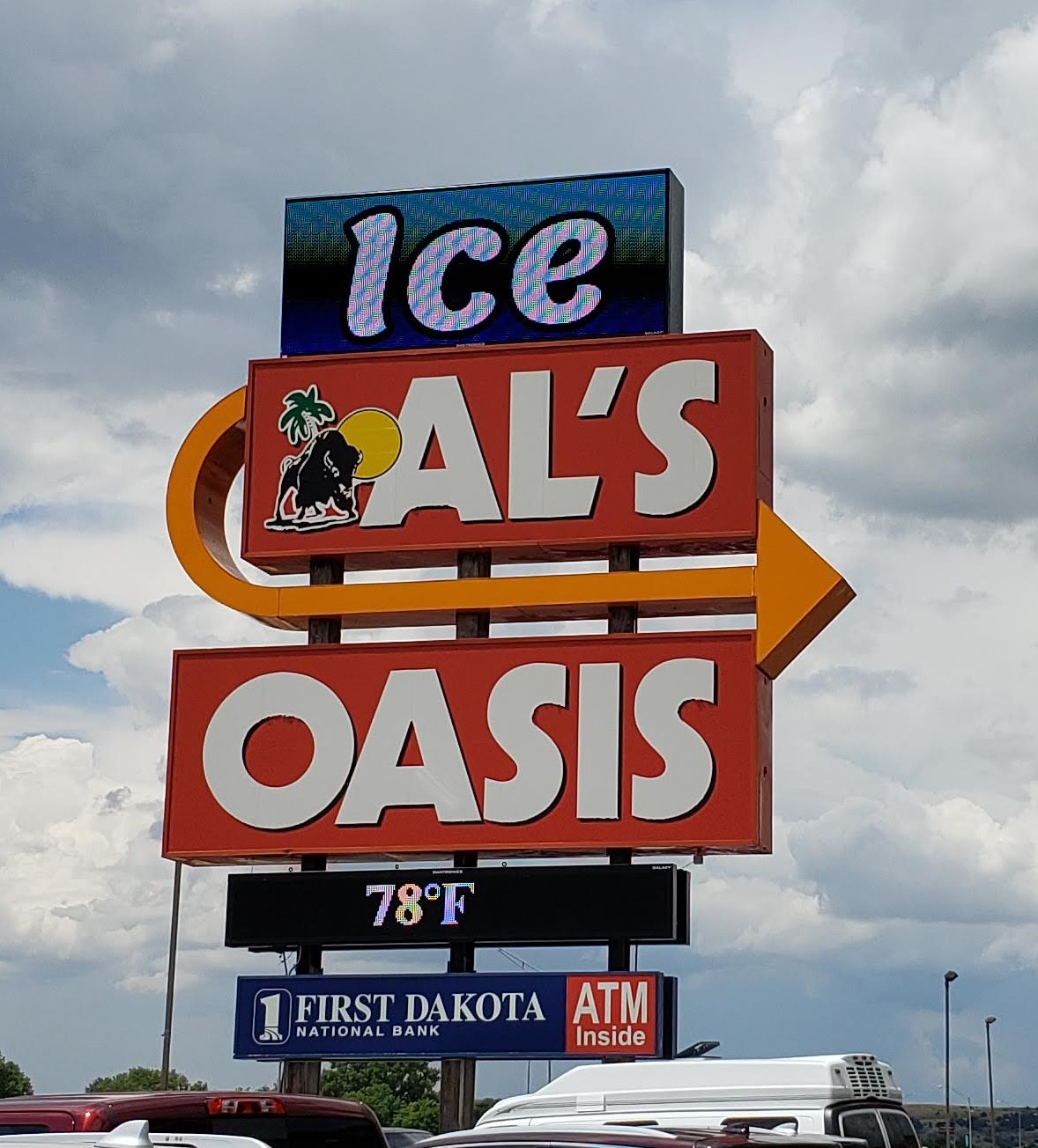 SUNDAY 6/27, LUNCH: Halfway through South Dakota it seemed logical to stop at Al’s Oasis, one of the most heavily advertised places along I-90 that we’d skipped on our first South Dakota tour in 2009. Its origins date back to 1919, when a German World War I veteran emigrated to America and opened a grocery outside Oacoma, back when cattle were a big deal ’round those parts. Today Al’s is a huge strip mall enshrouded in faux Western trimmings and enough roadside billboards in their name that it’s easy to write them off as just another Wall Drug but with less crappy merchandise. I wouldn’t know because we avoided the shops.
