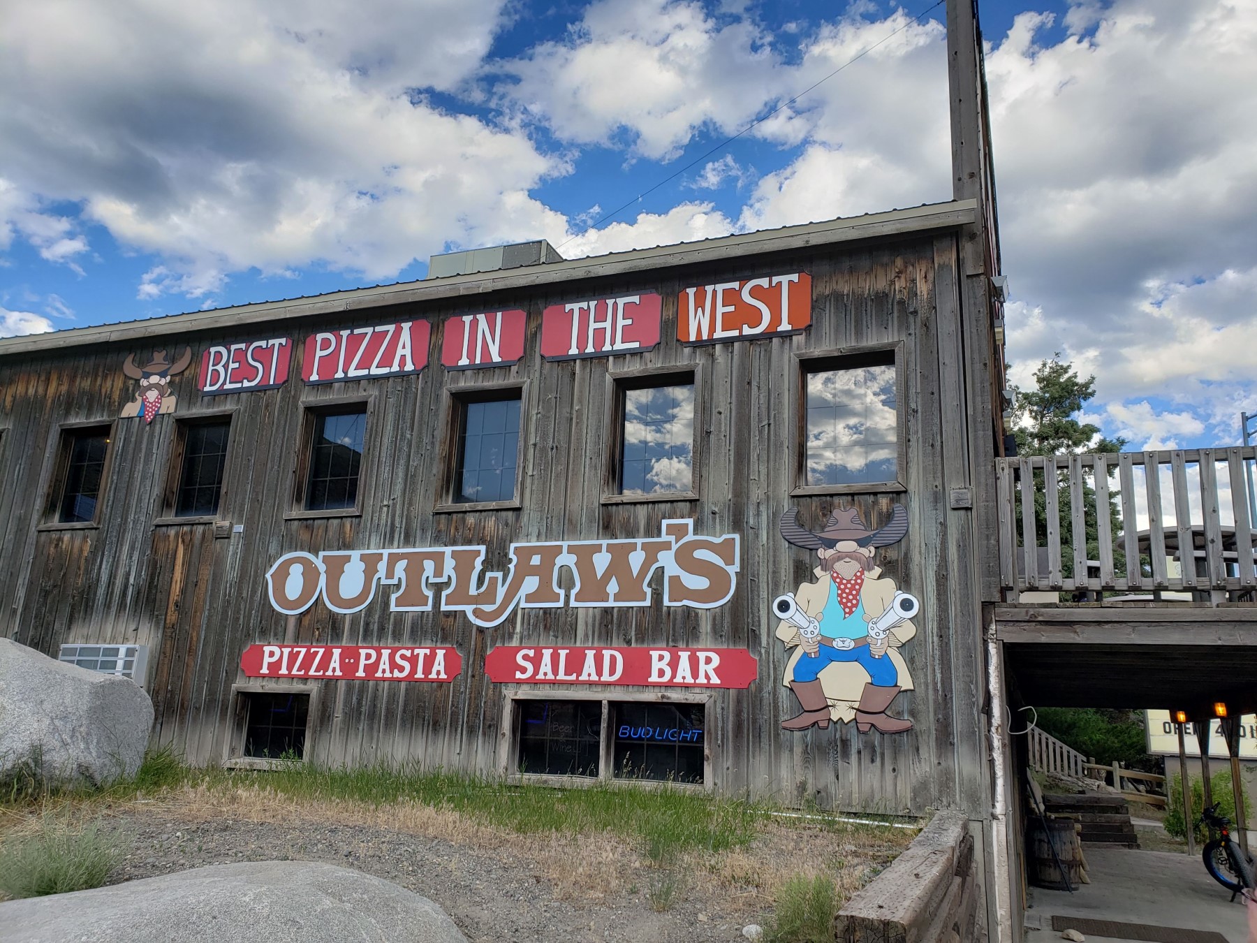 TUESDAY 6/29, DINNER: We spent the evening in the tiny town of Gardiner, Montana, nestled next to Yellowstone’s north entrance. By my count they had more restaurants than parking spaces. Our hotel clerk gave us a few handy tourism tips, named a few nearby eateries that were only open sporadically, and a caution that the hotel parking spaces would likewise fill up quickly, and to move our car was to risk having to relocate it somewhere much, much farther away for the evening. After the ten-hour Yellowstone travel experience, that sounded not remotely appealing, nor did a long walk to other dining options. We therefore settled for the restaurant right next door, Outlaw’s Pizza. We weren’t in the mood for pizza two nights in a row, but their mural ad promised meal alternatives.