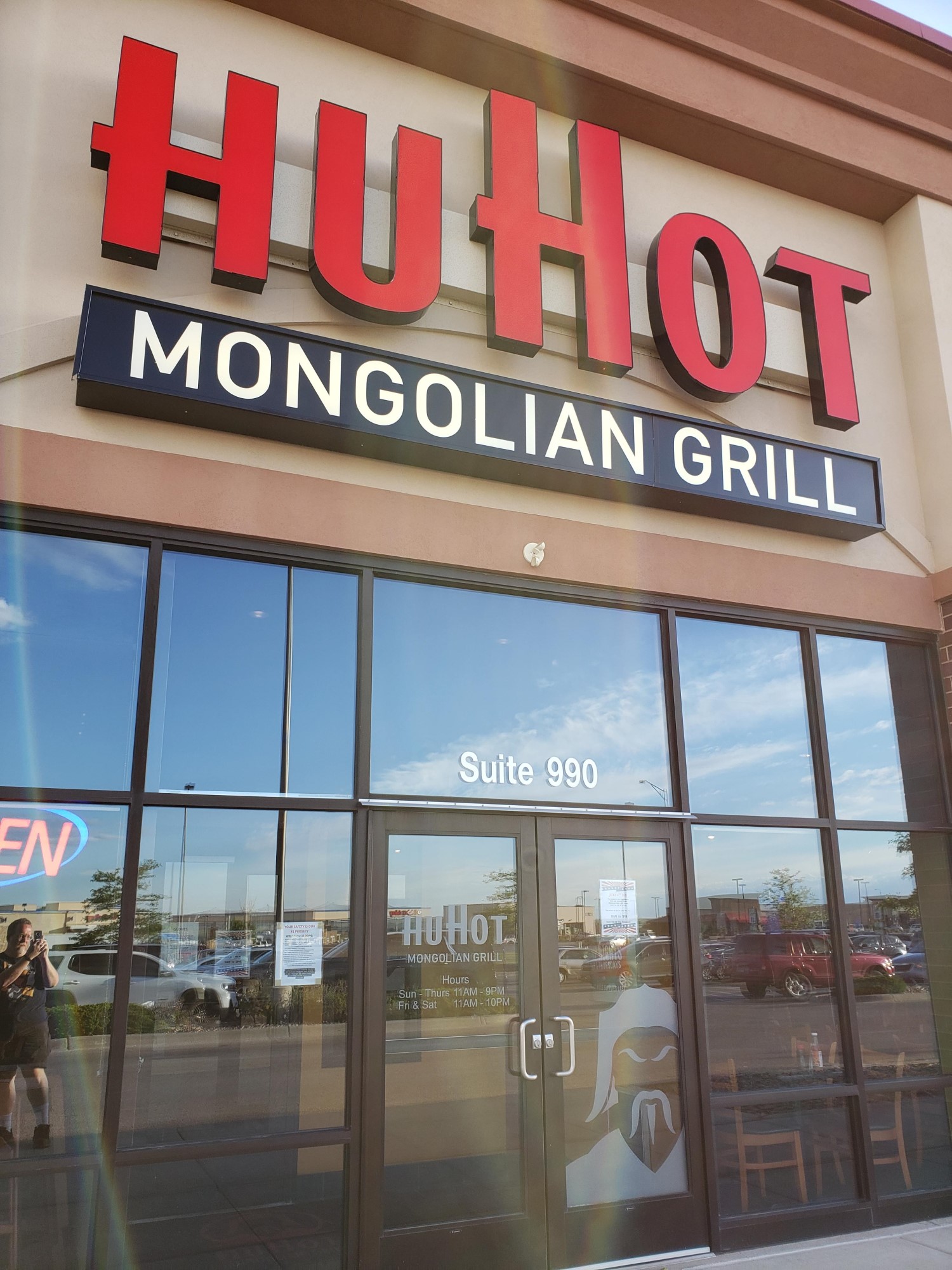 I headed in the direction of the nearest strip mall — awful lot of those across America nowadays, as it happens — and, en route to one familiar name that we’d return to in a later city, slammed the brakes as I spotted the name of an old friend: a chain of limited reach called HuHot Mongolian Grill, one of those Asian near-buffets where you toss several raw ingredients into a bowl and a lineup of chefs cook it for you.
