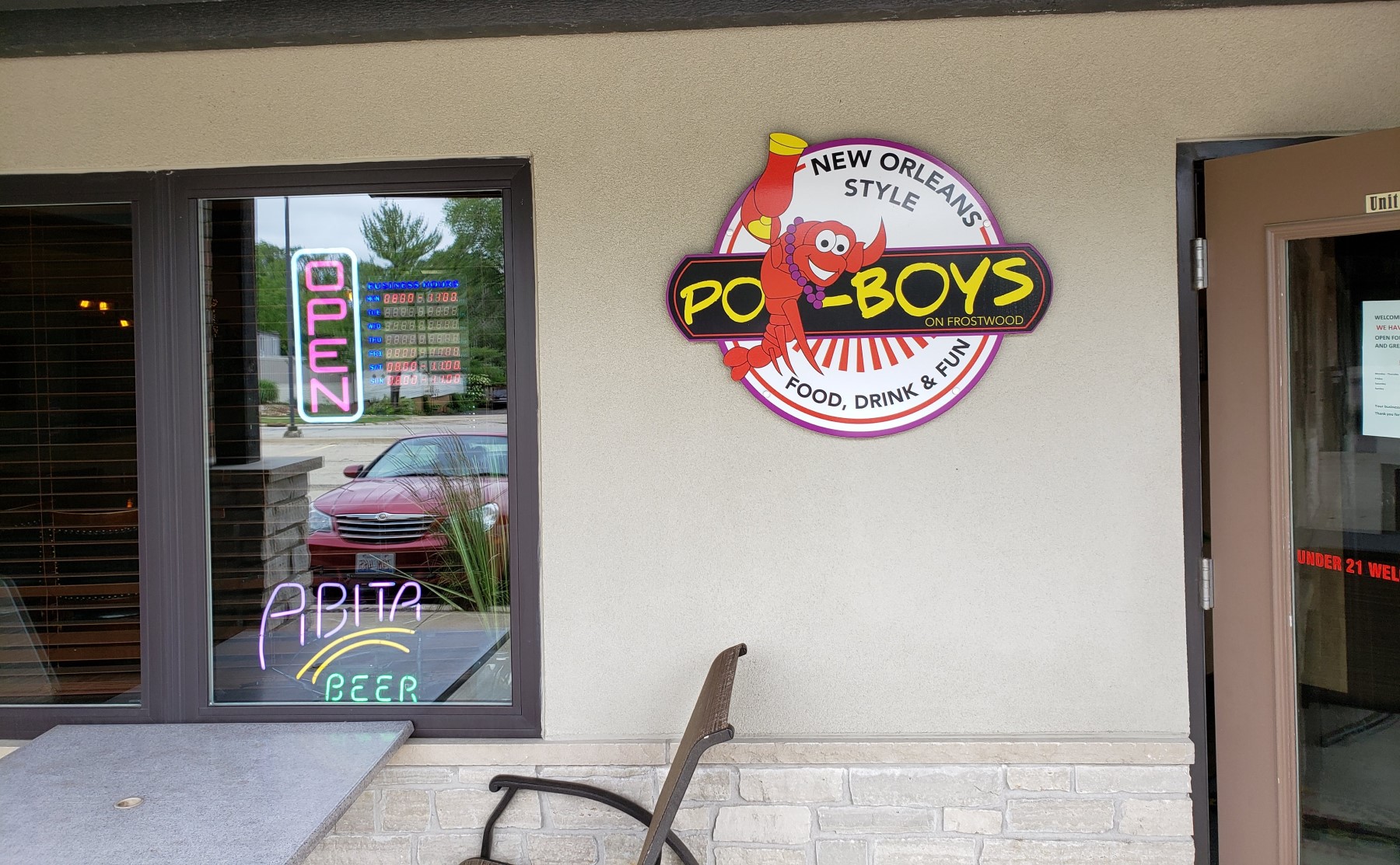 FRIDAY 6/25, LUNCH: We called time-out in Peoria, Illinois. Our first try was a bar called Po-Boys whose signage boasted New Orleans-style fixings. We walked in through the unlocked door but were duly informed they presently only serve dinner, not lunch. Daytime hours were for alcohol and machine gambling only, neither of which are our thing.
