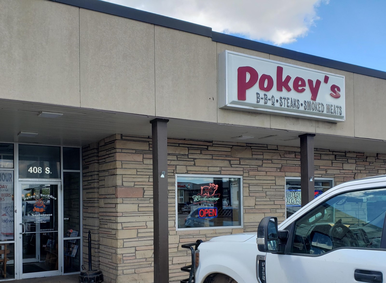 MONDAY 6/28, LUNCH: Deep in the heart of Gillette, Wyoming, was the rootin’-est, tootin’-est little barbecue joint of our entire trip, Pokey’s BBQ by name. Only a single waitress was working, the kind of lady our age and size with a gruff voice that’s friendly to those who’ve merited it but don’t have to take no sass when menfolk get too uppity, but she’d do right by us as long as we kept our britches on. That’s their grilled kangaroo dinner in our lead photo. Yes, kangaroo. For well-heeled adventurous types, they also have ostrich, wild boar, python, and gator tail along with the more standard game.