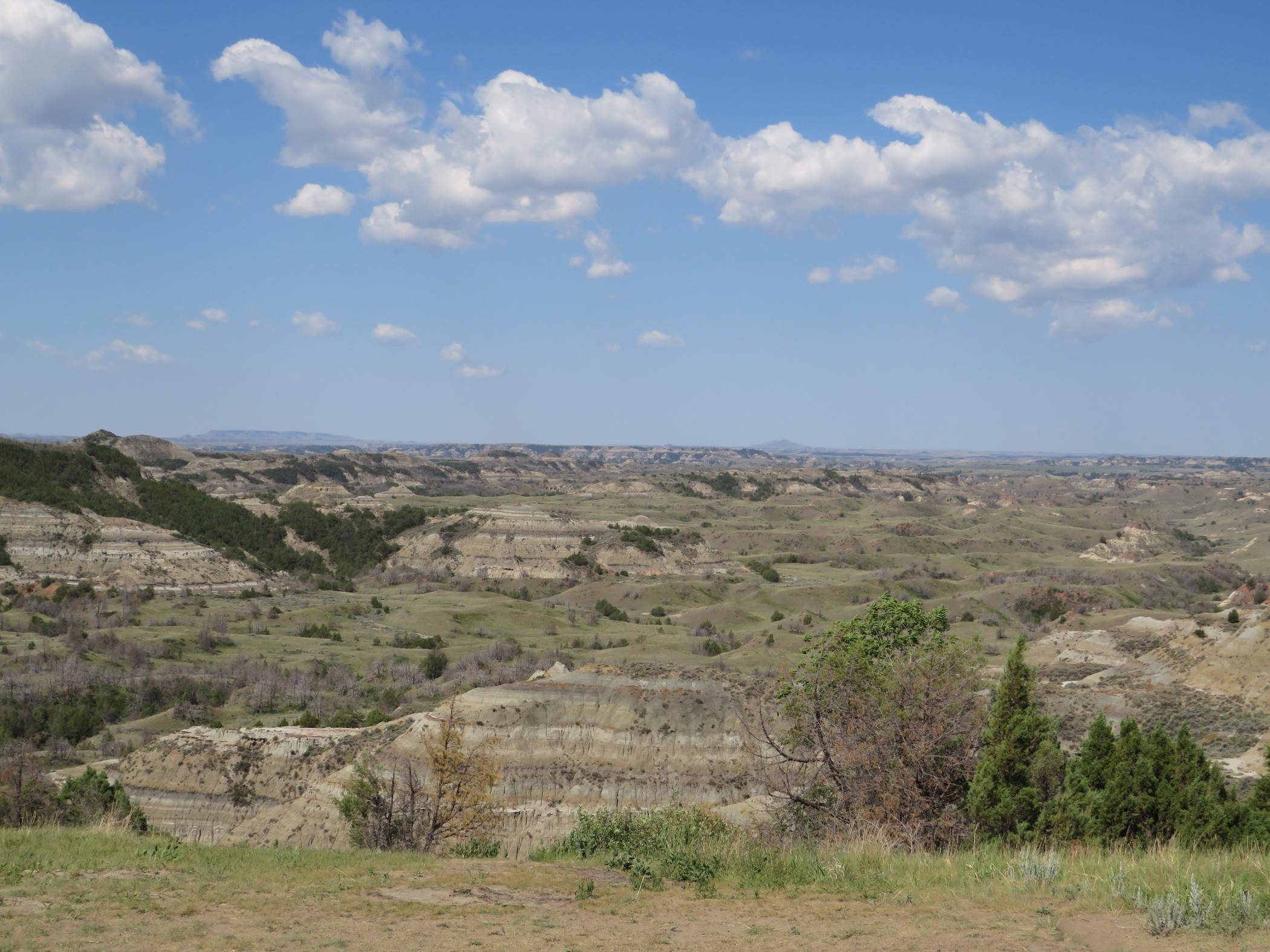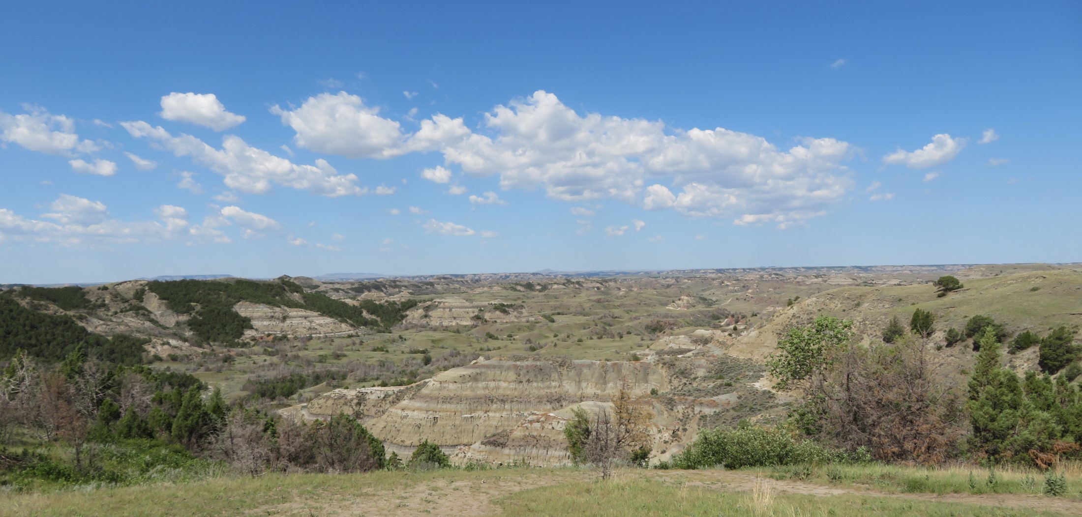 Less than an hour east of Glendive is Theodore Roosevelt National Park, over 70,000 acres comprising the outer reaches of the Badlands, which sprawl across the western ends of both Dakotas. Officially designated a national park in 1947, it was named after a local bison hunter turned cattle rancher, U.S. President, and pioneering conservationist in that order. The park is divided into three units, closest of which to the interstate is the South Unit. The North Unit is another 68 miles beyond the South Unit, much of it mountainous and winding, and our time was limited. The Elkhorn Ranch Unit, where Roosevelt owned the eponymous grounds for a few years, is between the other two, but its roads were more rugged, largely unpaved, reportedly quite steep, and likely uninviting to our rental car. Our couple hours’ exploration were therefore limited to the South Unit.
