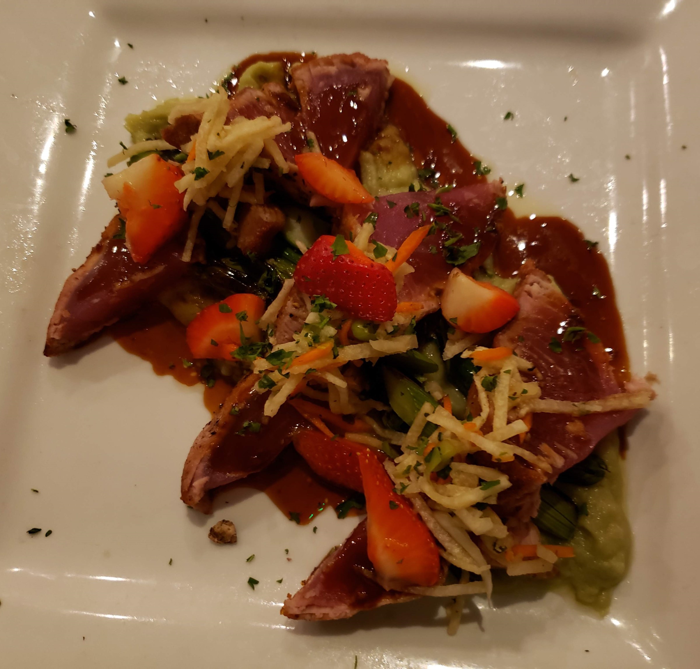 For my main dish, three parallel slices of Wild Ahi Tuna, lightly seared with wasabi potato puree, grilled asparagus under and perpendicular to the ahi, strawberry/jicama slaw and a soy-ginger glaze. Admittedly the strawberries were a weird addition.