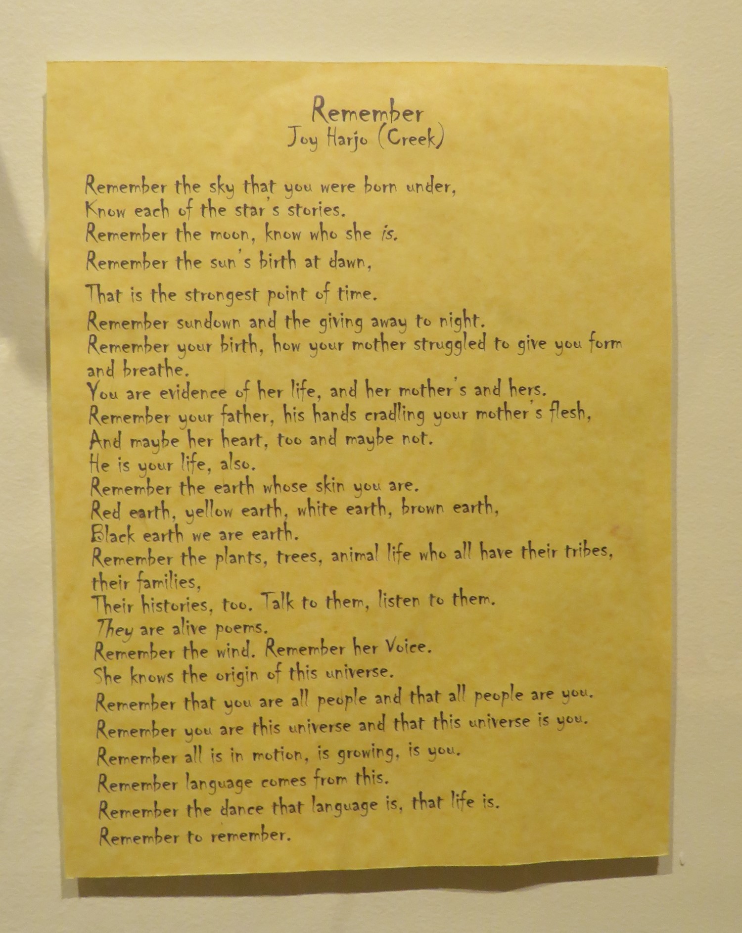 A poem by Muscogee author Joy Harjo. I once attended a poetry reading she held at my college circa 1991.