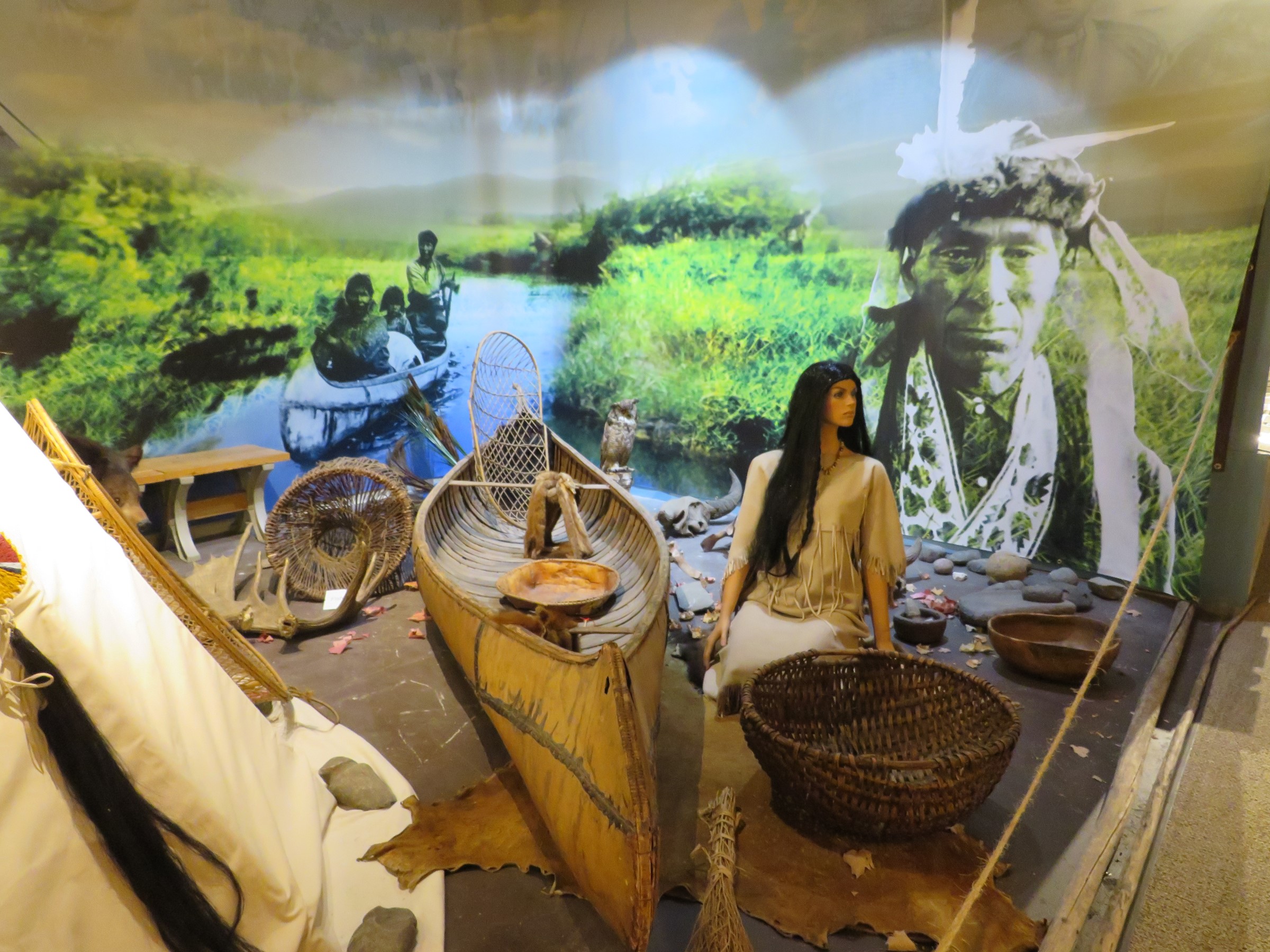 Mixed-media dioramas combine mannequins, taxidermy, artifacts, replicas, and dynamic photographic art.