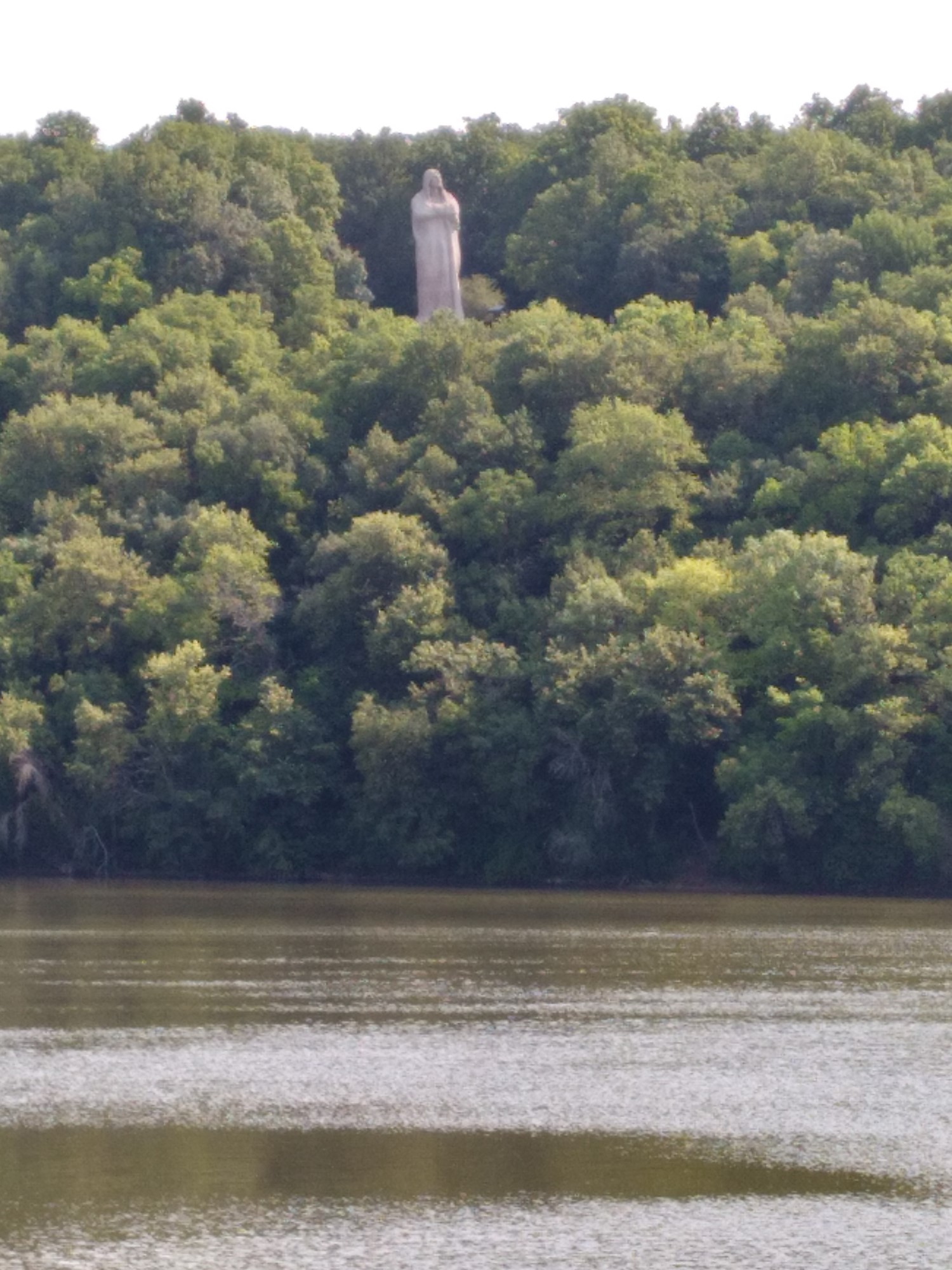 Getting a head-on view of him from within the park was impossible without a jet pack. We exited the park, returned to the highway and crossed the Rock River into the small town of Oregon. Turning north on River Road takes you through their equivalent of a Main Street and on toward a riverside parking lot with a clear if distant view of Black Hawk across the way.