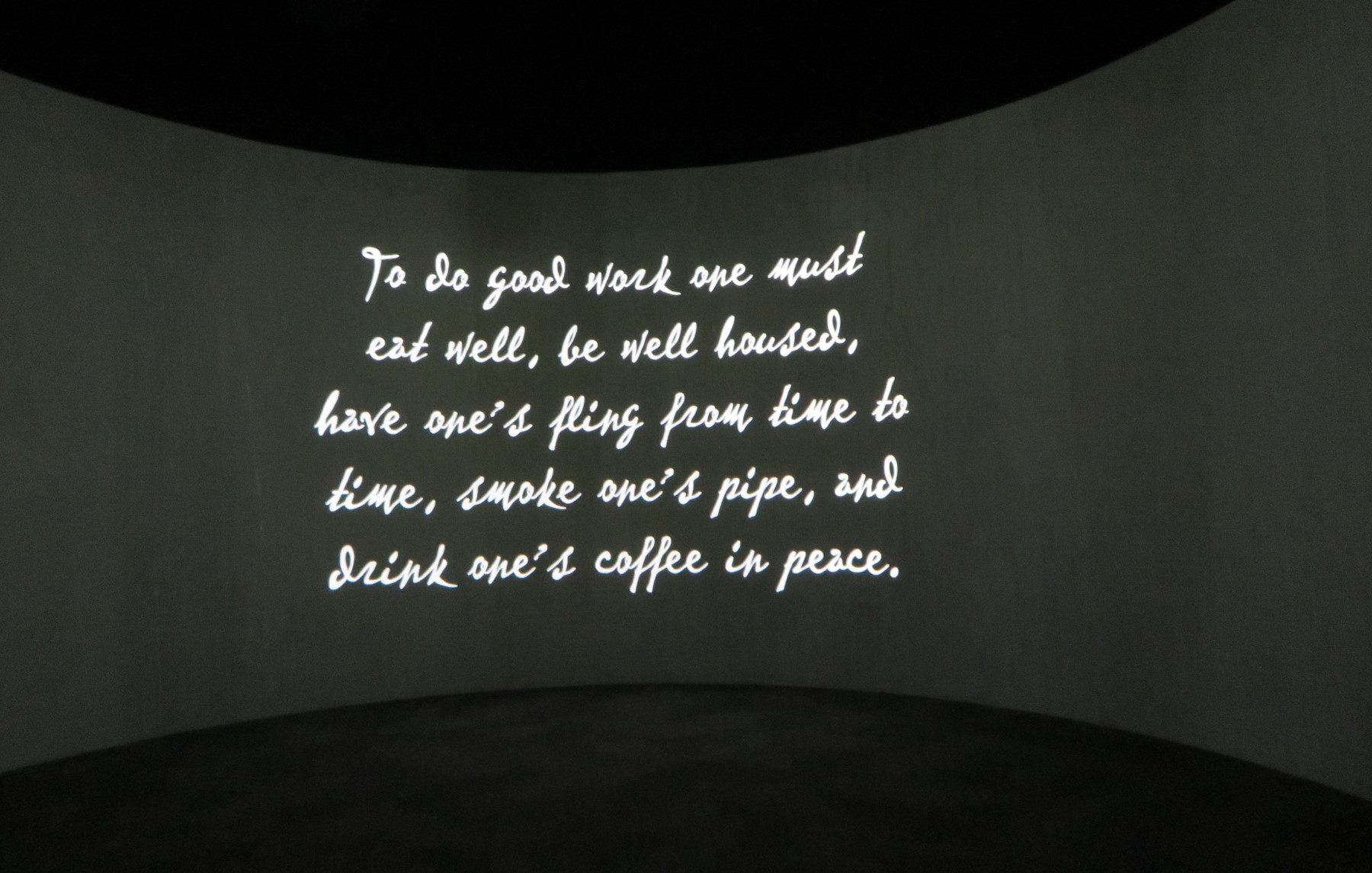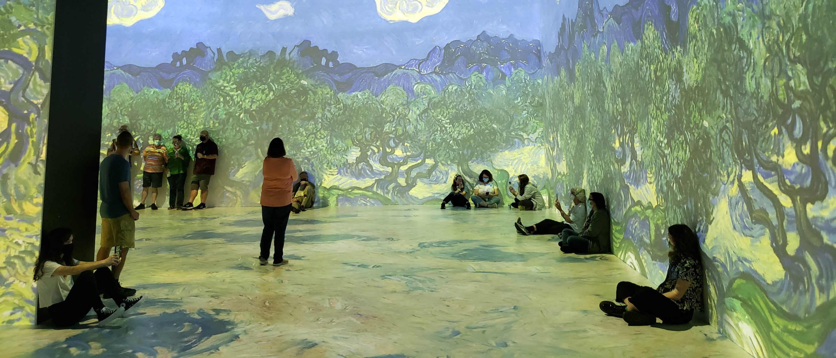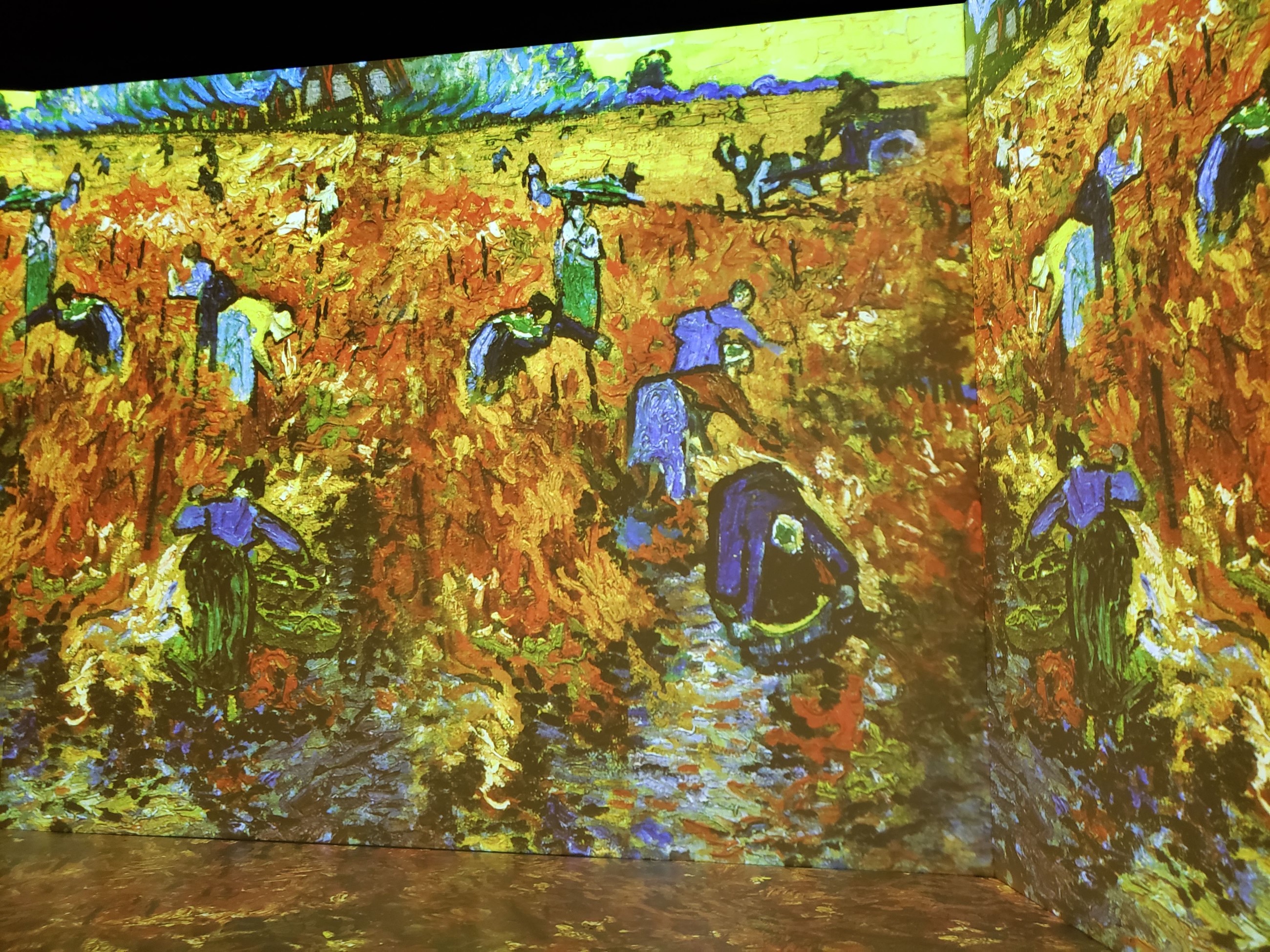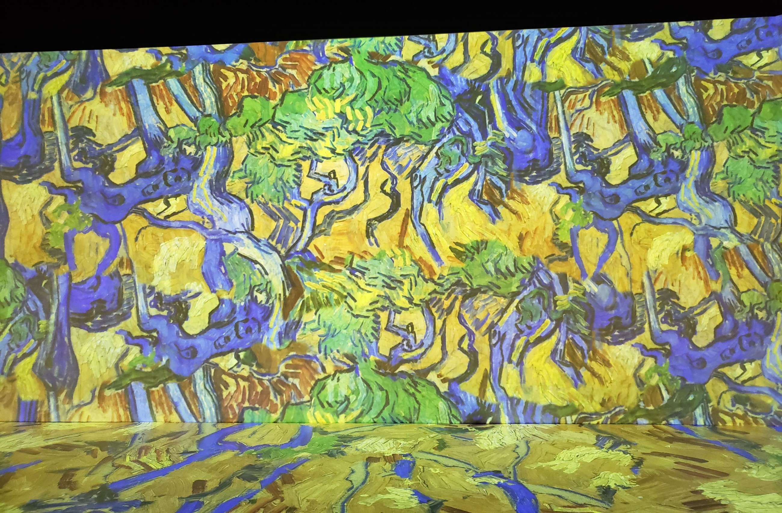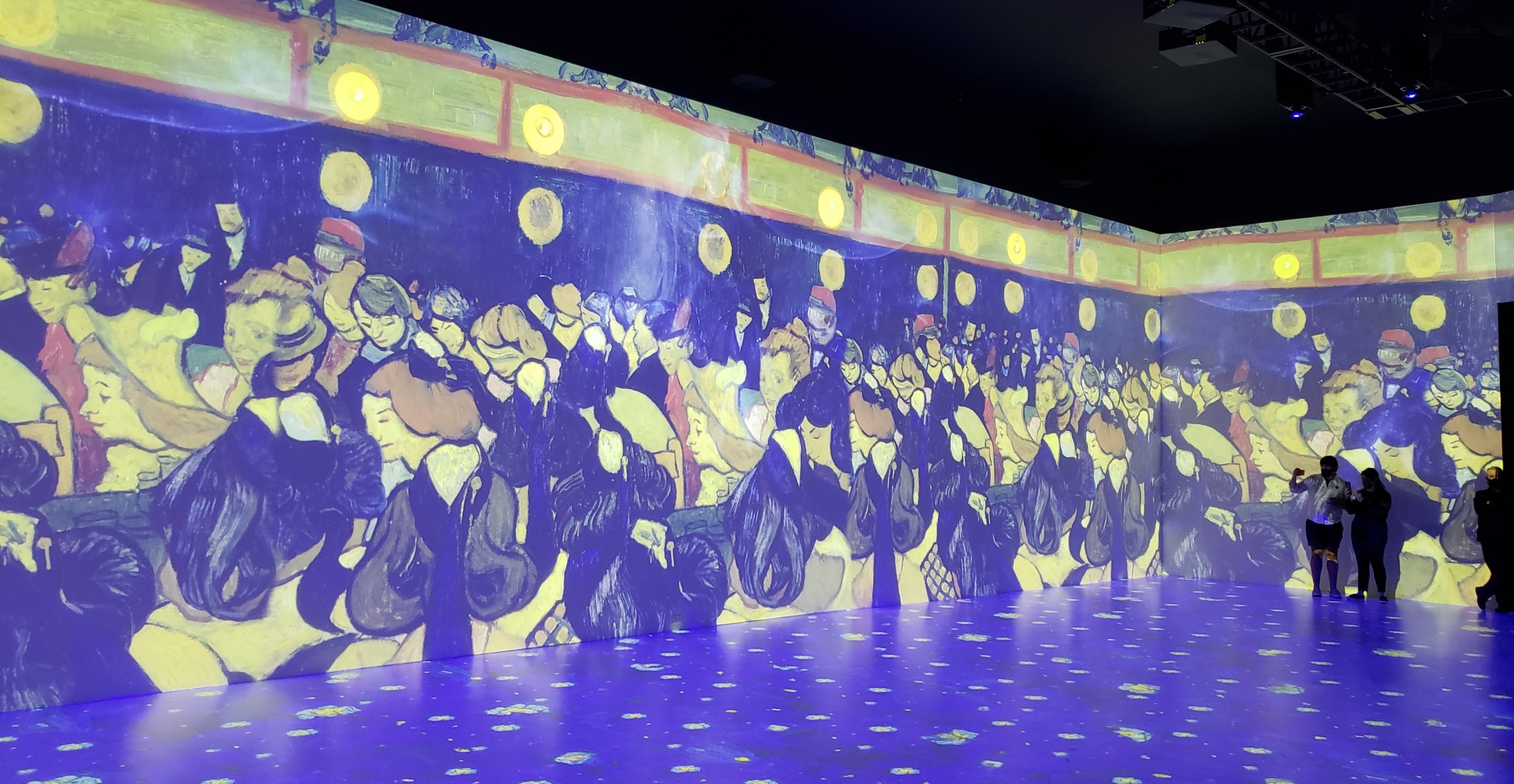 We managed to find some pretty things for the occasion at Newfields, the institution formerly known as the Indianapolis Museum of Art. Last year they emptied out their top floor and converted it into a temporary, floor-wide installation with a very different approach to art. Instead of hanging paintings on the walls, they turned out the lights, turned the walls into projection screens, and filled the place with a rotating array of blown-up paintings. The montages emphasize the works of Vincent Van Gogh, but other Impressionists might be in the mix, along with works from at least one other continent altogether.