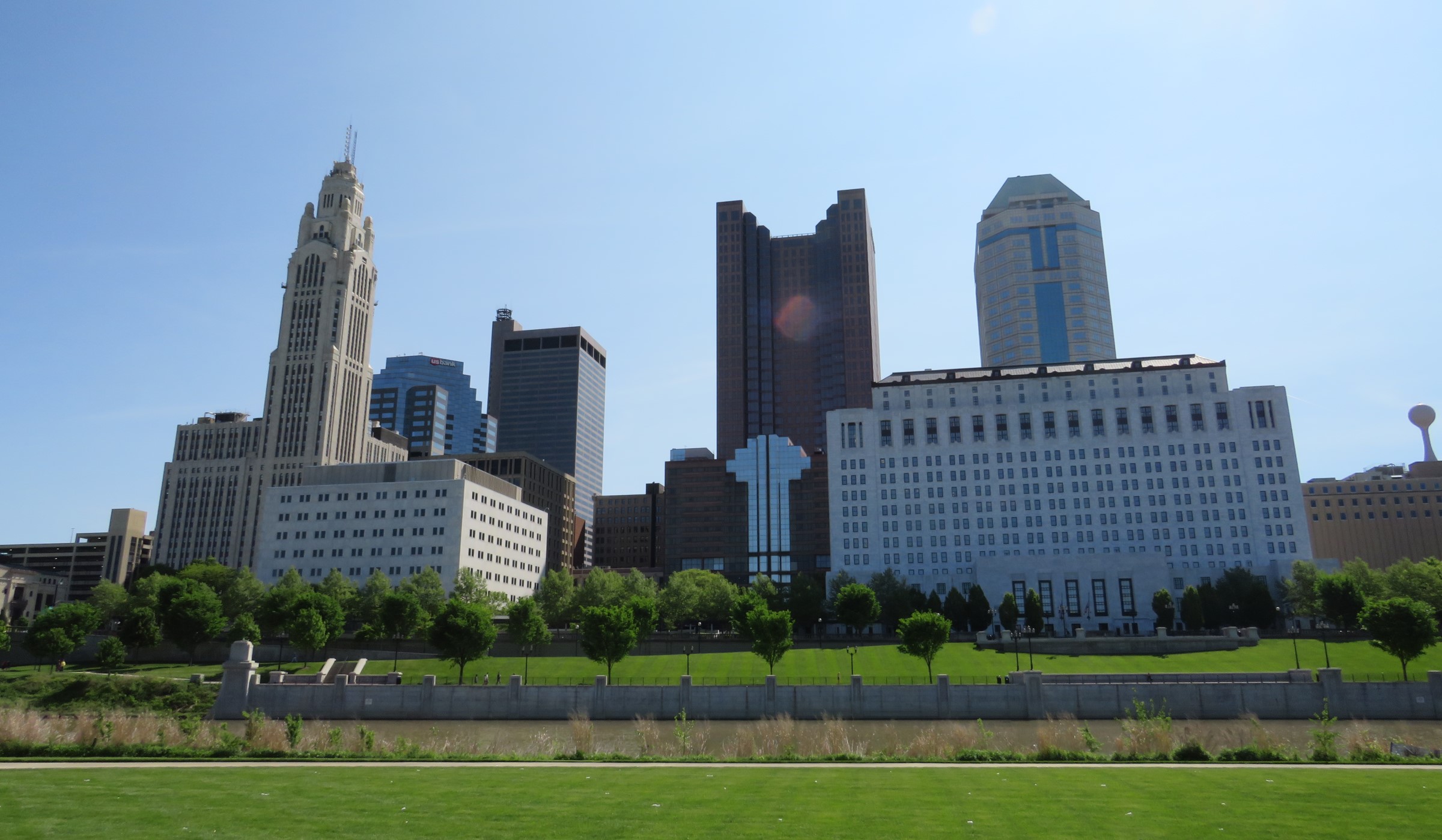 As it happens, I-70 from Indy to Columbus was such a smooth drive that morning, even with multiple construction impediments, that we arrived a half-hour before they opened. We passed that time walking a lap around their campus, which includes a stretch of Columbus’ Downtown River Walk along the banks of the Scioto.