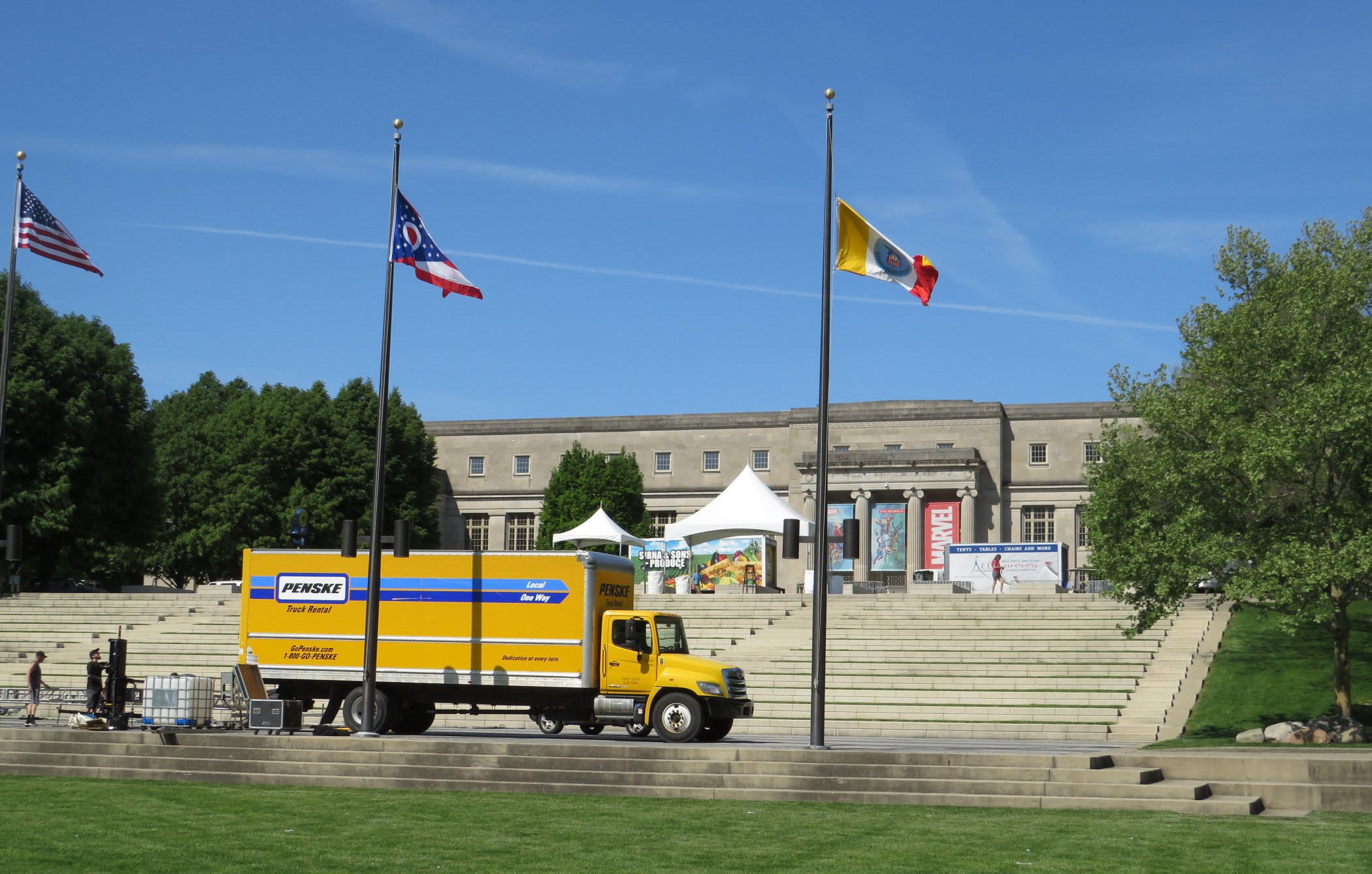 Outside the COSI”s east wing, a stage setup was in progress as part of a Saturday night craft beer festival. The crew was gracious enough not to chase us away.