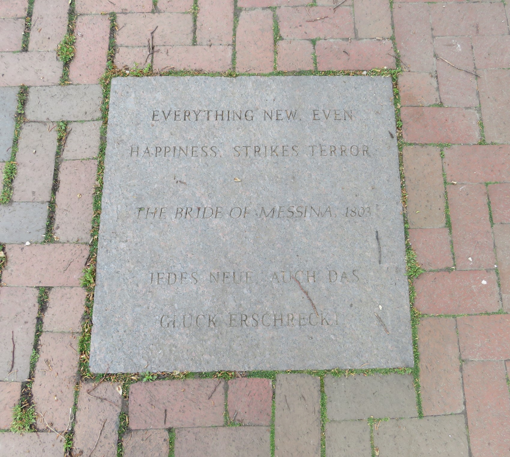 Quotes from Schiller’s plays line the sidewalks. From the 1803 faux Greek tragedy The Bride of Messina: “Everything new, even happiness, strikes terror.”