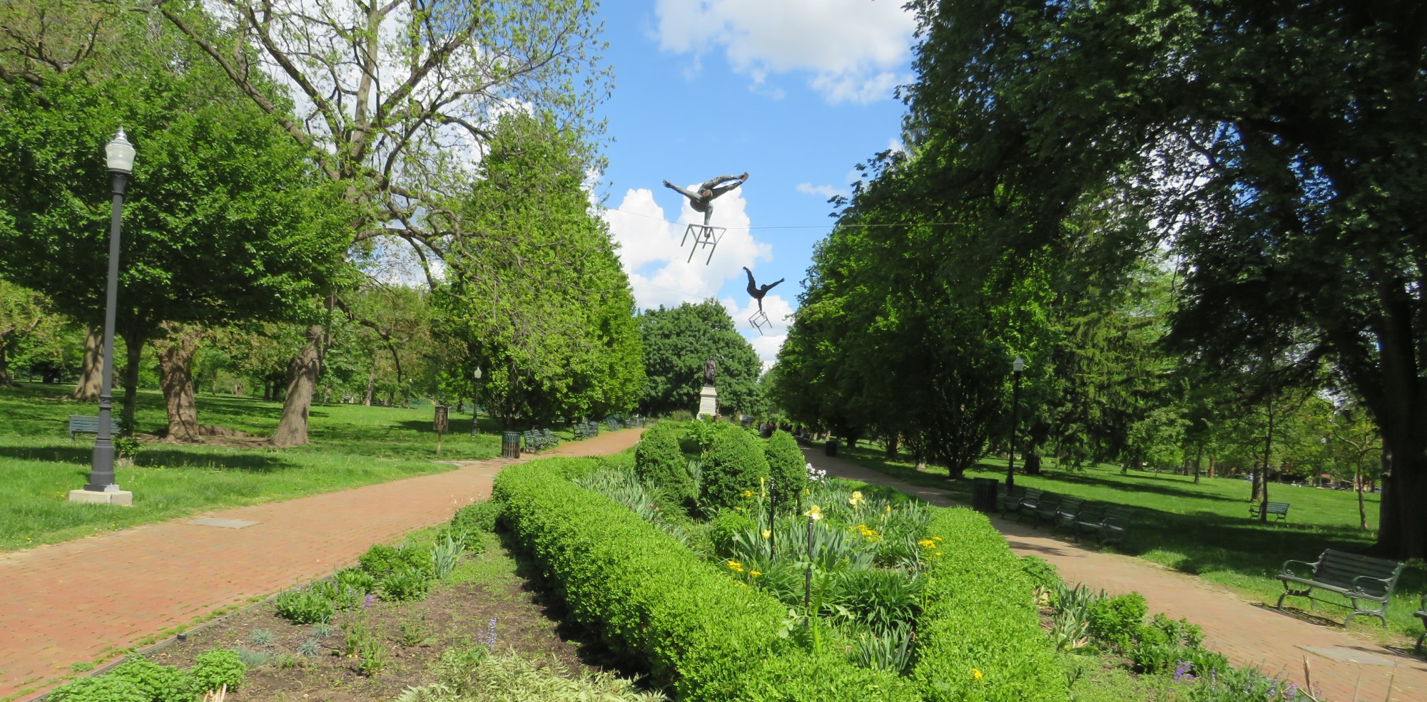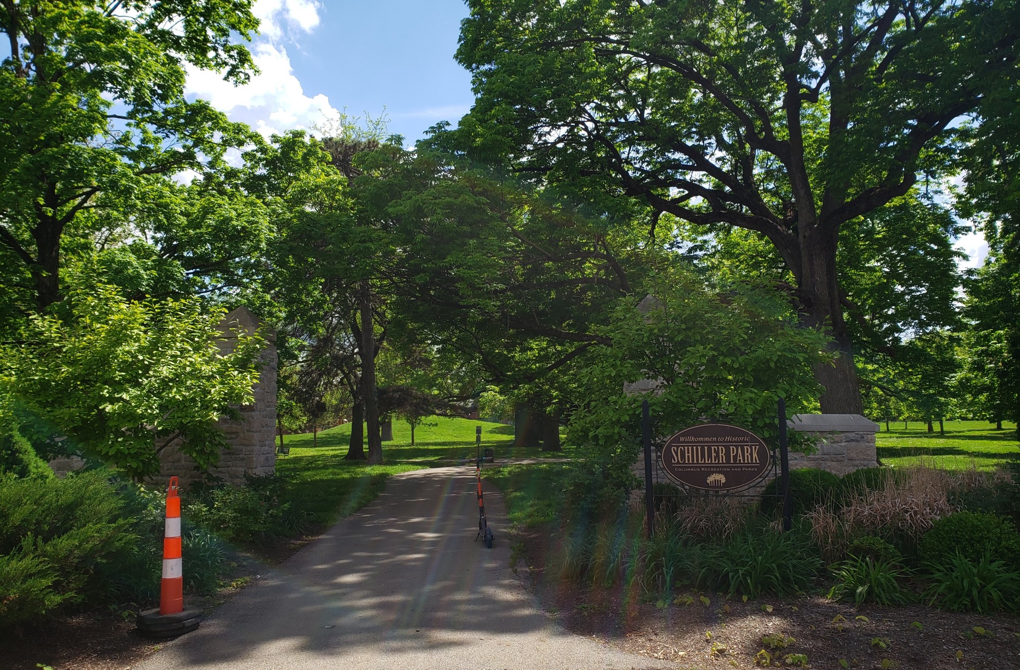 From the Center of Science and Industry we took a short hop south to German Village, a historic neighborhood with quite a few small businesses clustered within. We did some shopping (more about that in a later entry) and some eating (ditto, but different later entry), but in between stops we decided to exercise our middle-aged-couple privilege to call time-out on all the jaunting and go enjoy some peace and quiet at the nearest park. Its grounds had a few modestly nifty sights to catch, so it wasn’t just us starting at grass and trying to remember the Good Old Days.