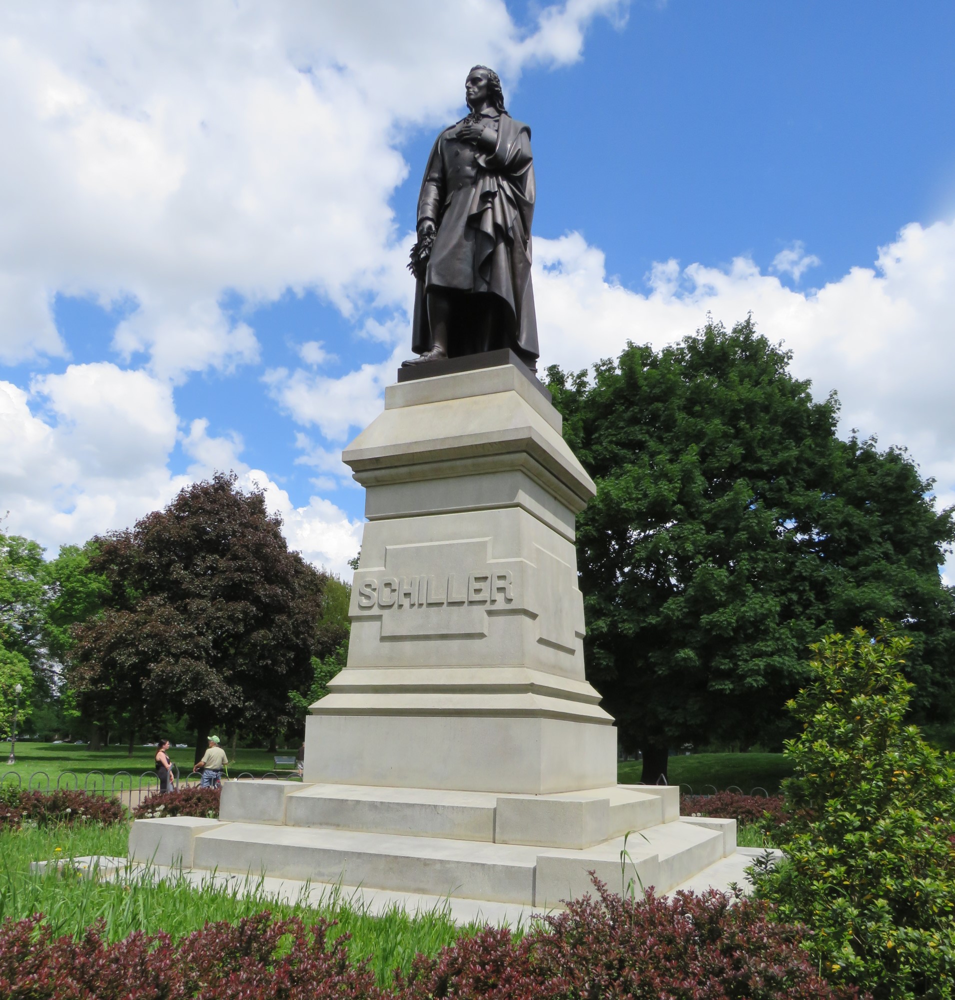 The park’s centerpiece is a statue of Schiller himself (1759-1805) placed on a pedestal, by Max von Widnmann. This is a second cast made in 1891 in Germany; the 1863 original stands in Munich.