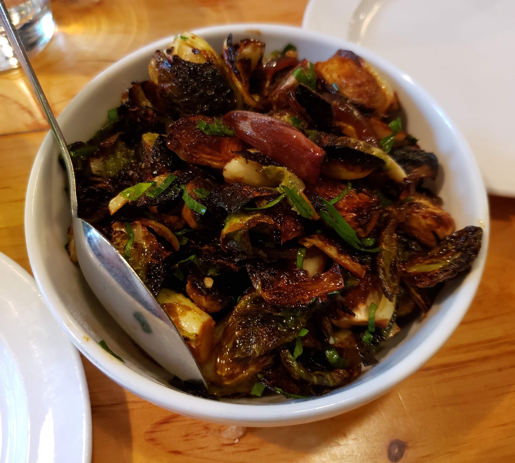 Brussels sprouts in agrodolce with pickled red onions. Not the best Brussels sprouts we’ve had this year, but they hold their own.